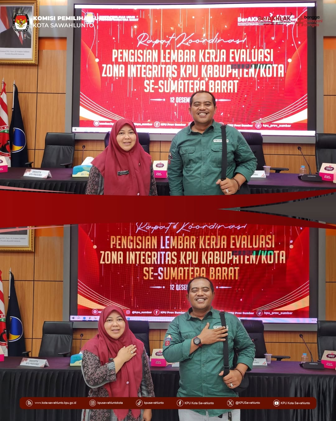 TemanPemilih, KPU Kota Sawahlunto hadiri Rapat Koordinasi Pengisian Lembar Kerja Evaluasi Zona Integritas KPU Kabupaten/Kota se Sumatera Barat yang dilaksanakan oleh KPU Provinsi Sumatera Barat pada Jum’at (12/12). Kegiatan ini dibuka oleh Plh. Ketua KPU Provinsi Sumatera Barat Medo Patria, dan turut dihadiri oleh Anggota KPU Sumatera Barat Hamdan, Plh Sekretaris Jumiyati, dan Kabag Teknis dan Hukum Sutrisno.