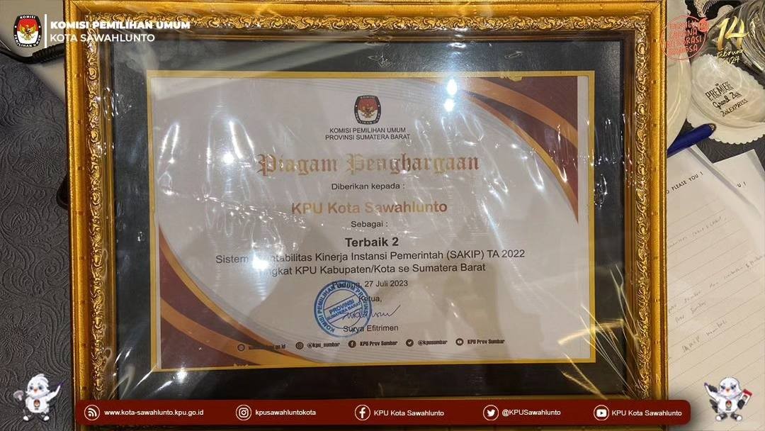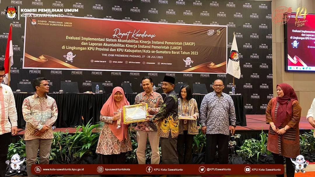 Dalam kesempatan ini KPU Kota Sawahlunto meraih penghargaan Terbaik 2 kategori Sistem Instabilitas Kinerja Pemerintah (SAKIP) TA 2022 Tingkat KPU Kabupaten/Kota Se-Sumatera Barat.