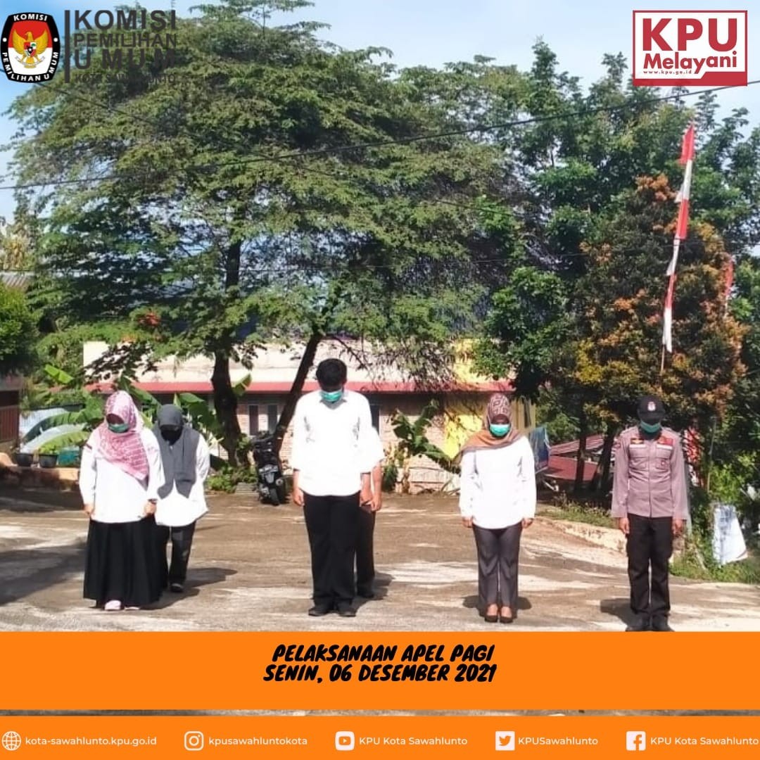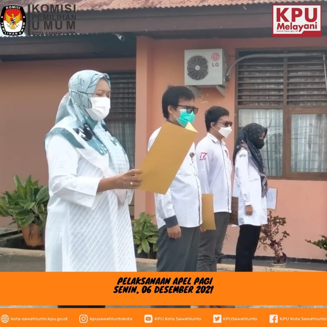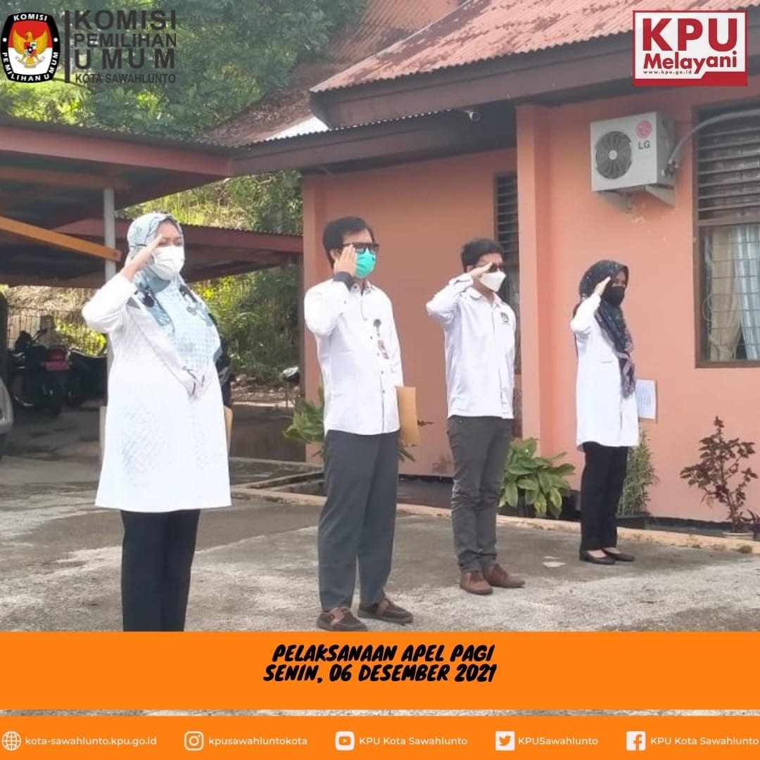 Agenda apel diawali dengan penghormatan kepada bendera merah putih diiringi lagu Indonesia Raya, dilanjutkan dengan mengheningkan cipta, pembacaan Pancasila, Pembukaan UUD 1945 dan Panca Prasetya Korp Pegawai RI. Bertindak sebagai pembina apel hari ini adalah Ibu Juni Lesmita Devi, SE (Sekretaris KPU Kota Sawahlunto). Dalam pengarahannya beliau menyampaikan bahwa hari ini KPU Kota Sawahlunto yang diwakili Ketua dan Komisioner menghadiri Penganugerahan Keterbukaan Informasi Publik Tahun 2021 di Balai Sidang Hatta Novotel Bukittinggi, apapun hasilnya nanti akan menjadi bahan evaluasi untuk kita dalam pelayan keterbukaan informasi publik kedepannya. Selain itu tentunya kita tetap menjaga protokol kesehatan dalam beraktifitas sehari-hari.