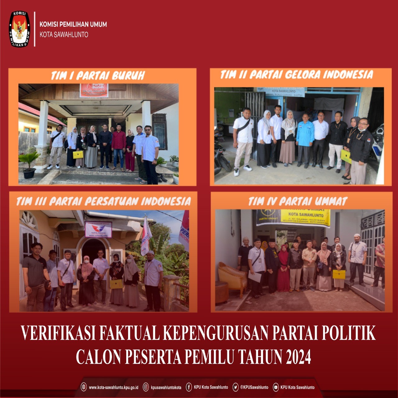Verifikasi faktual yang dibagi dalam 4 (empat) Tim ini dipimpin oleh Ketua bersama Anggota KPU Kota Sawahlunto dan Sekretaris didampingi jajaran sekretariat.
