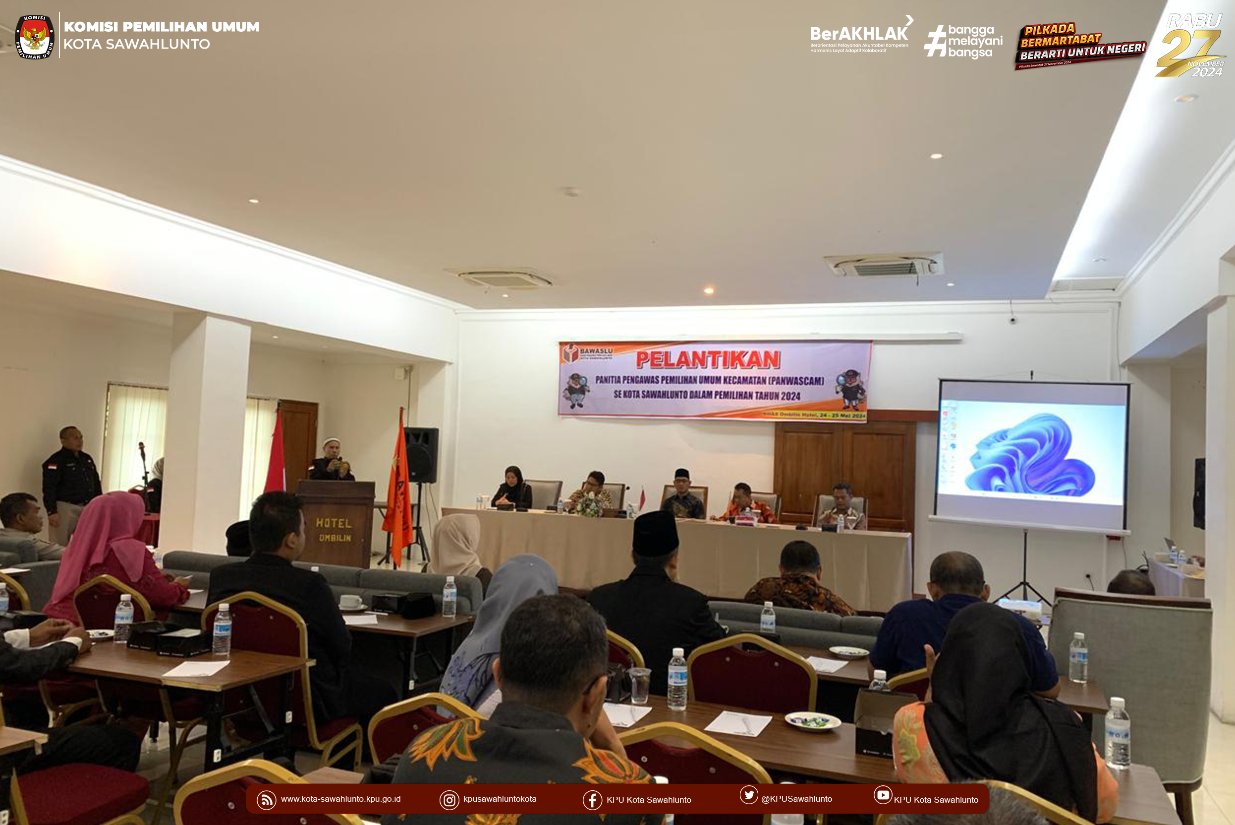 Sawahlunto, kota-sawahlunto.kpu.go.id - KPU Kota Sawahlunto dalam hal ini Ketua KPU Kota Sawahlunto beserta Staf Sub Bagian Teknis Penyelenggaraan Pemilu, Partisipasi dan Hubungan Masyarakat hadiri Pelantikan Panitia Pengawas Kecamatan (Panwascam) di Khas Ombilin Hotel Sawahlunto, Jum'at (24/5).
