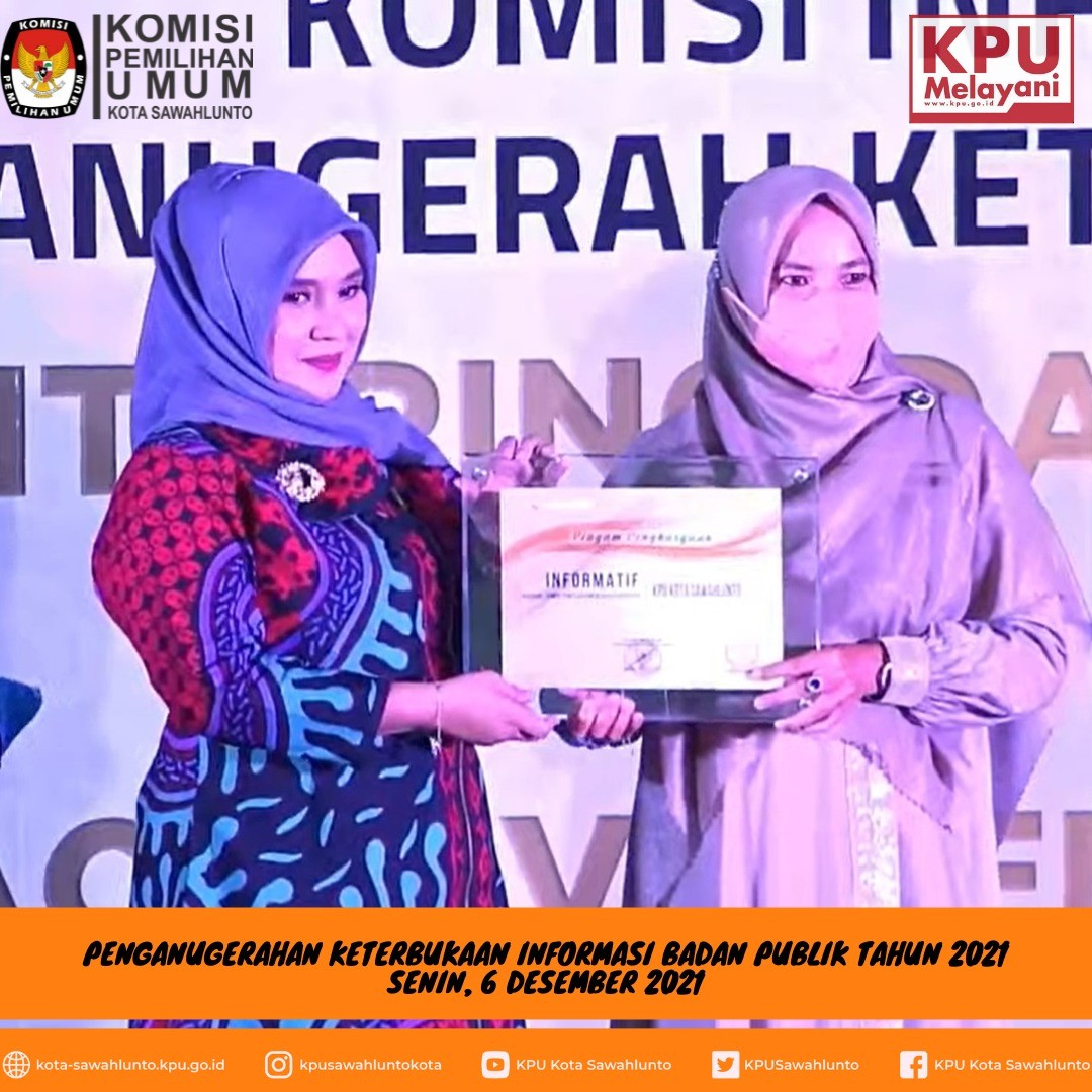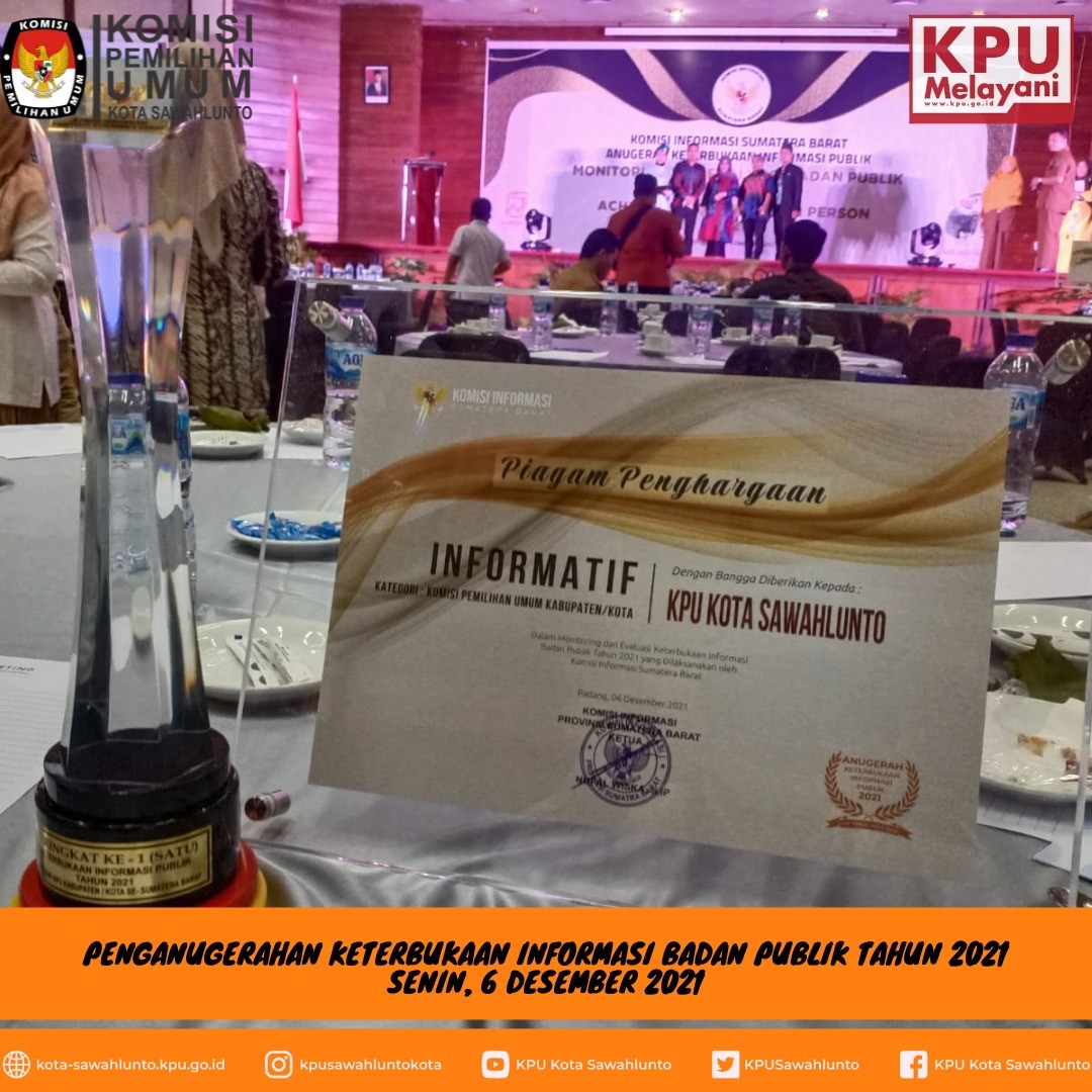 Anugrah Badan Publik ini merupakan puncak dari kegiatan Monitoring dan Evaluasi dari badan Publik Se-Sumatera Barat, yang sudah dimulai oleh KI sekitar 2 (dua) bulan yang lalu. Ada 10 kategori badan publik yang dinilai. Untuk kategori KPU Kabupaten/Kota Se-Sumatera Barat, KPU Kota Sawahlunto mendapatkan predikat Informatif dan menjadi Peringkat 1. Diperingkat 2 ada KPU Kota Bukittinggi dan KPU Kabupaten Dharmasraya diperingkat 3. Peringkat 1 ini merupakan kali ketiga yang didapatkan oleh KPU Kota Sawahlunto dalam penilaian keterbukaan informasi dari KI. KPU Kota Sawahlunto mengucapkan terima kasih kepada Komisi Informasi Provinsi Sumatera Barat yang setiap tahun selalu melakukan evaluasi demi perbaikan pelayanan informasi publik. Semoga hasil evaluasi tahun ini bisa menjadikan KPU Kota Sawahlunto lebih baik dalam pelayanan informasi publik.