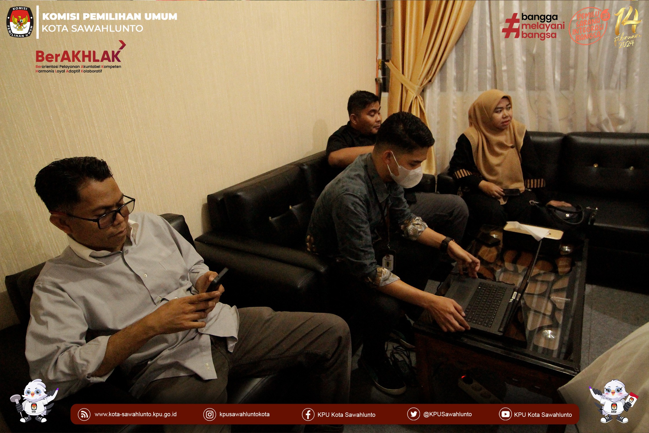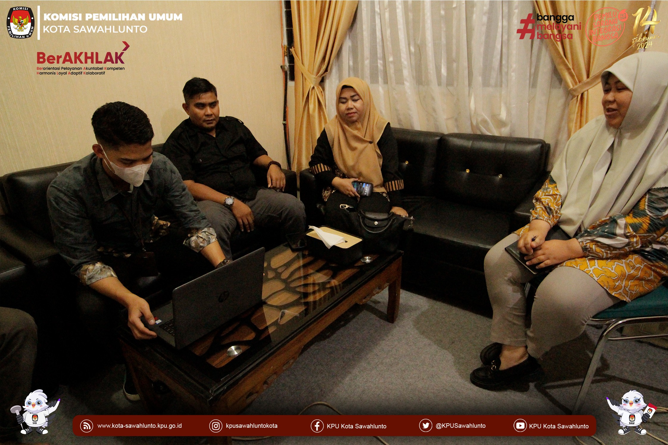 Hadir menerima kunjungan tersebut Ketua Divisi Sosdiklih Parmas dan SDM KPU Kota Sawahlunto, Sekretaris KPU Kota Sawahlunto, Kepala Sub Bagian Teknis Penyelenggaraan Pemilu, Partisipasi dan Hubungan Masyarakat beserta Operator Siparmas KPU Kota Sawahlunto.