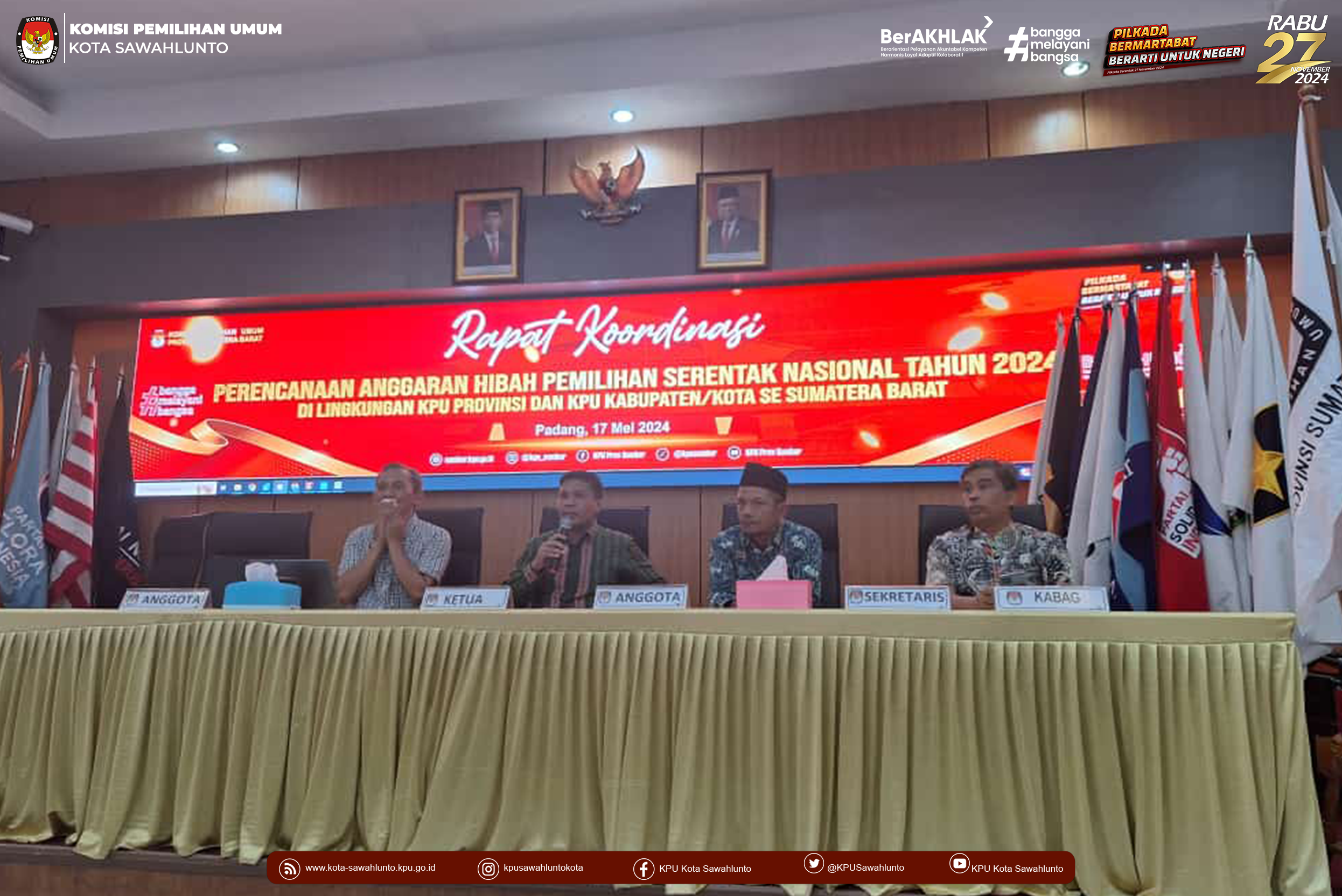 KPU Kota Sawahlunto mengikuti kegiatan Rapat Koordinasi Perencanaan dan Pengelolaan Anggaran Hibah Pemilihan serentak Nasional Tahun 2024 di Lingkungan KPU Provinsi Sumatera Barat dengan KPU Kabupaten/Kota se-Sumatera Barat, Jum'at (17/5).