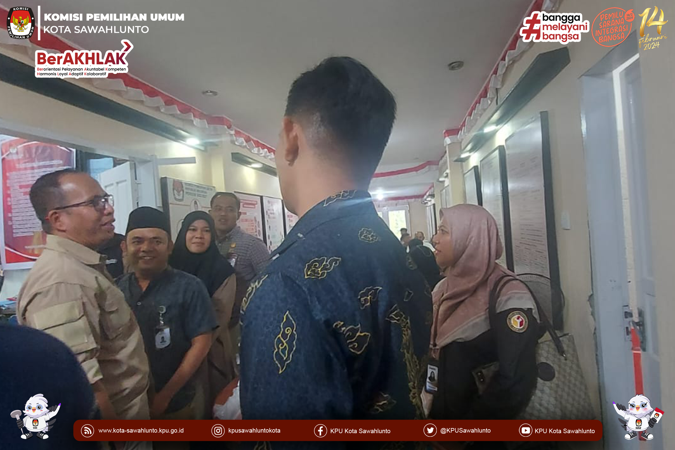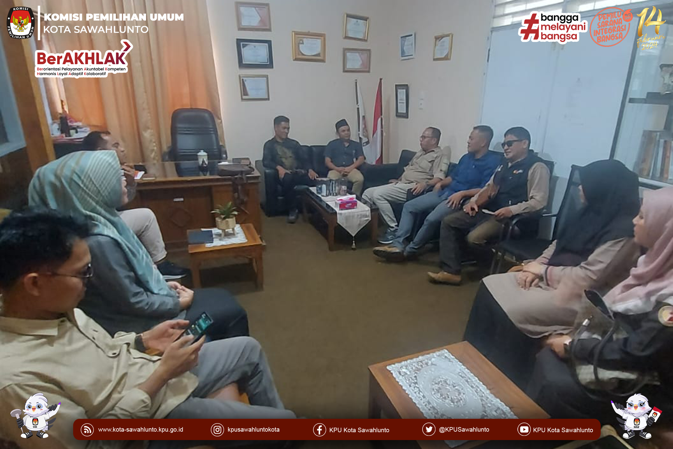 Ketua, Anggota dan Sekretaris KPU Kota Sawahlunto menerima kunjungan Bawaslu Provinsi Sumatera Barat dalam rangka Pengawasan Sortir dan Lipat Surat Suara Pemilu 2024, Selasa sore (16/1).
