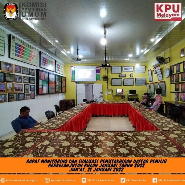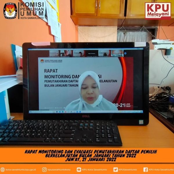 KPU Kota Sawahlunto ikuti Monitoring Evaluasi (Monev) DPB (Data Pemilih Berkelanjutan) bulan Januari Tahun 2022 pada Kamis-Jumat, 20-21/1. Kegiatan dimulai pukul 09.00 WIB - selesai.