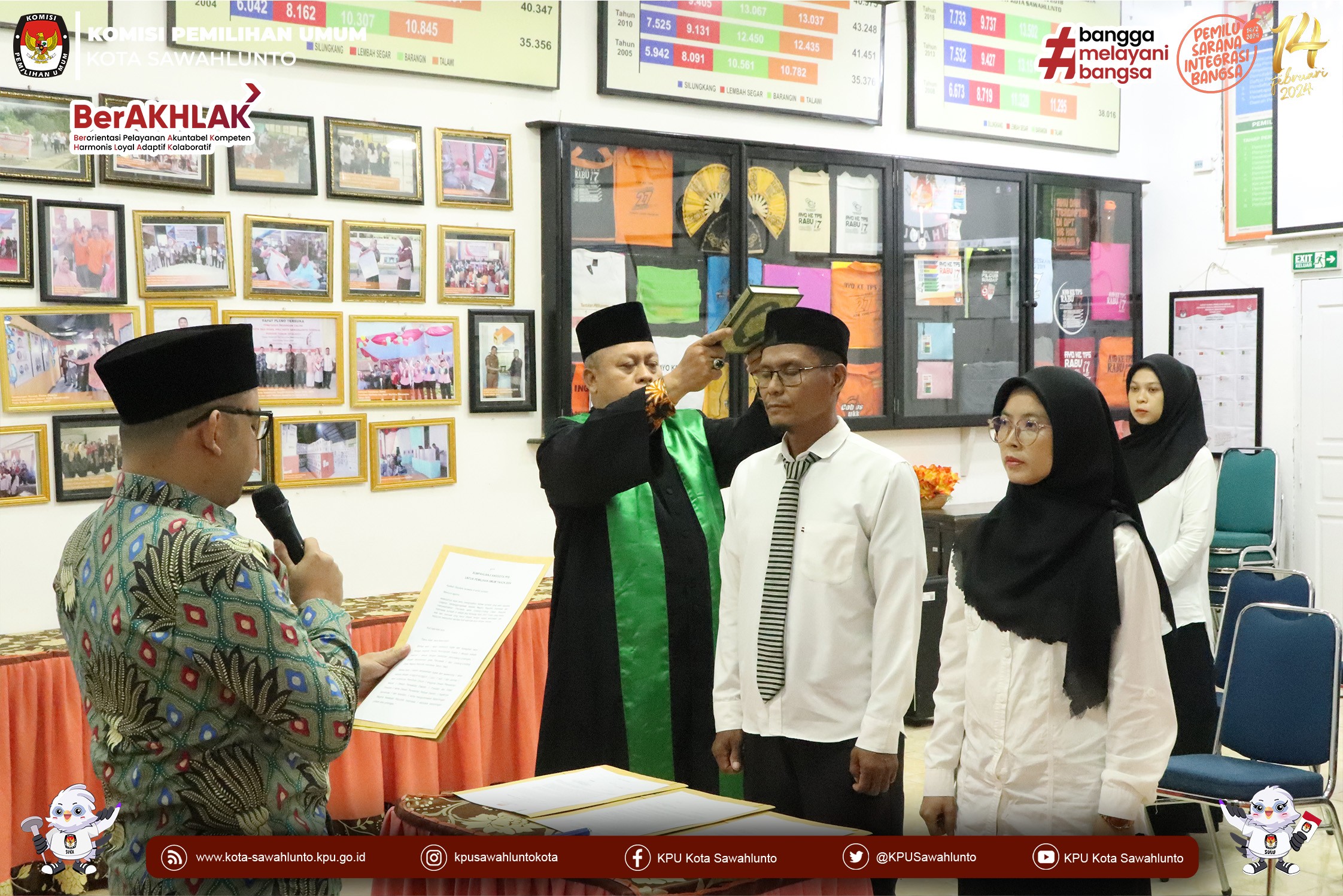 Sawahlunto, kota-sawahlunto.kpu.go.id - KPU Kota Sawahlunto melaksanakan Pelantikan PAW Anggota PPS Desa Sikalang dan Penandatanganan Pakta Integritas Staf Sekretariat PPK Talawi, Kamis (14/12). Pelantikan PAW tersebut dilaksanakan karena Anggota PPS Desa Sikalang mengundurkan diri, digantikan oleh Gunadi. Sedangkan untuk Sekretariat PPK Talawi terjadi pergantian karena halangan tetap a.n Edimartahuda dan digantikan oleh Astry Septianty.