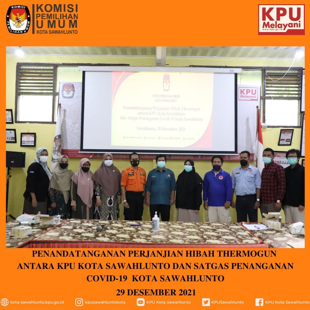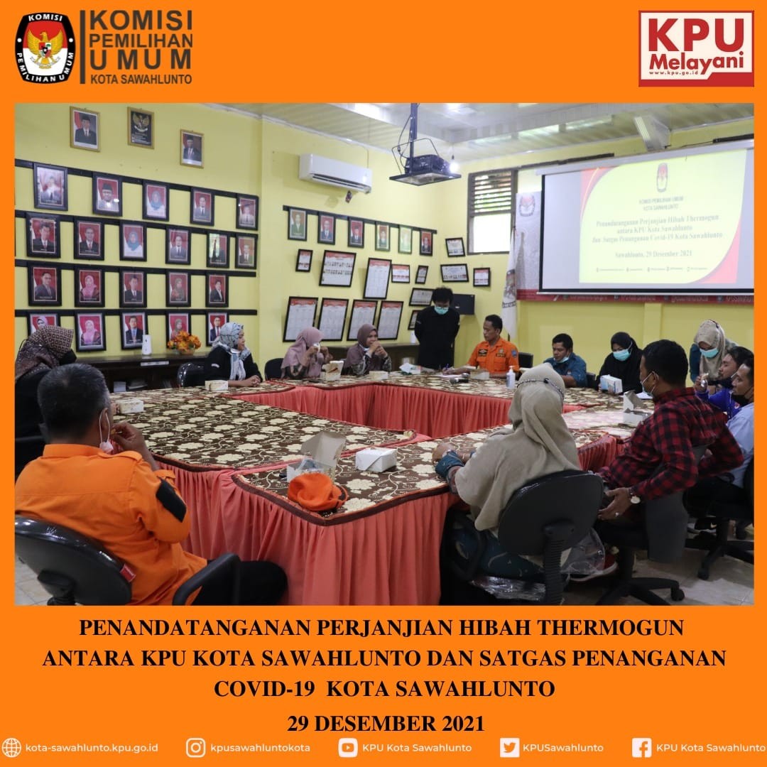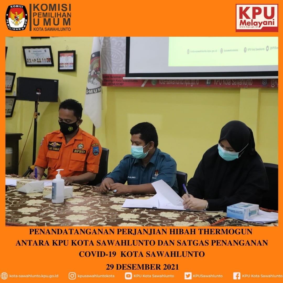 Sawahlunto, kota-sawahlunto.kpu.go.id – Komisi Pemilihan Umum (KPU) Kota Sawahlunto melakukan penandatanganan Perjanjian Hibah thermogun dengan Satgas Penanganan Covid-19 Kota Sawahlunto. Kegiatan ini dilaksanakan menindaklanjuti Surat Sekretaris Jenderal KPU RI perihal Persetujuan Hibah Barang Milik Negara berupa Thermogun pada Komisi Pemilihan Umum Penyelenggara Pemilihan Serentak Kepala Daerah Tahun 2020.