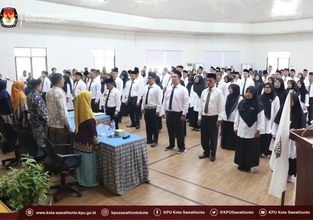 Sawahlunto, kota-sawahlunto.kpu.go.id - KPU Kota Sawahlunto melakukan Penetapan dan Bimbingan Teknis terhadap Sekretariat Panitia Pemungutan Suara (PPS) untuk 37 (Tiga Puluh Tujuh) Kelurahan/Desa yang ada di Kota Sawahlunto. Kegiatan dilaksanakan di Aula Balai Diklat Tambang Bawah Tanah Kota Sawahlunto, Selasa (31/1) pada pukul 09.00 WIB. Penetapan ini dilakukan dengan penandatanganan pakta integritas atas 111 (Seratus Sebelas) orang Sekretariat PPS se-Kota Sawahluntlo.