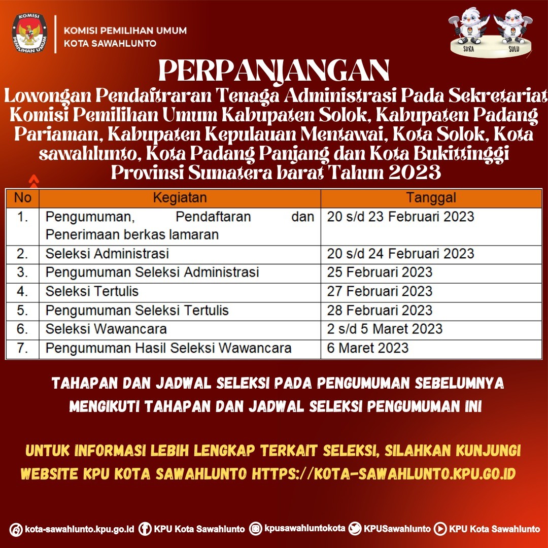 Sawahlunto, kota-sawahlunto.kpu.go.id - Pengumuman Perpanjangan Lowongan Pendaftaran Tenaga Administrasi pada Sekretariat Komisi Pemilihan Umum Kabupaten Solok, Kabupaten Padan Pariaman, Kabupaten Kepulauan Mentawai, Kota Solok, Kota Sawahlunto, Kota Padang Panjang dan Kota Bukittinggi Provinsi Sumatera Barat. Info selengkapnya klik disini ................
