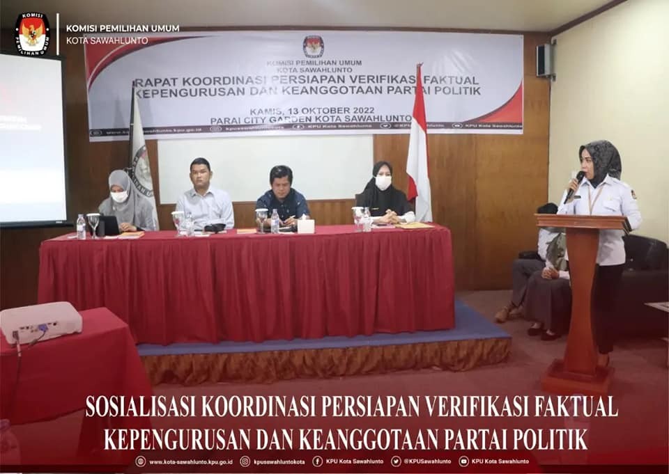 Sawahlunto, kota-sawahlunto.kpu.go.id, KPU Kota Sawahlunto melaksanakan Rapat Koordinasi Persiapan Verifikasi Faktual Kepengurusan dan Keanggotaan Partai Politik yang bertempat di Parai City Garden Kota Sawahlunto, Kamis (13/10/2022). Acara yang dimulai pada pukul 09.00 WIB ini diikuti oleh Perwakilan Partai Politik yang Berbadan Hukum di Tingkat Kota Sawahlunto, Perwakilan Bawaslu Kota Sawahlunto dan jajaran internal KPU Kota Sawahlunto yang terdiri dari Komisioner, Sekretaris, Kasubbag beserta staf sekretariat KPU Kota Sawahlunto. Kegiatan dibuka secara resmi oleh Ketua KPU Kota Sawahlunto Fadhlan Armey, dalam sambutannya menyampaikan bahwa, KPU telah menyelesaikan tahapan verifikasi administrasi kenggotaan Partai Politik, dan hasil verifikasi administrasi akan diumumkan oleh KPU RI pada tanggal 14 Oktober 2022.
