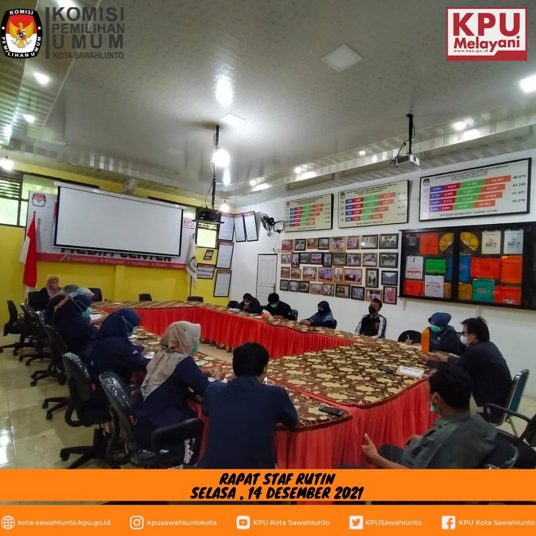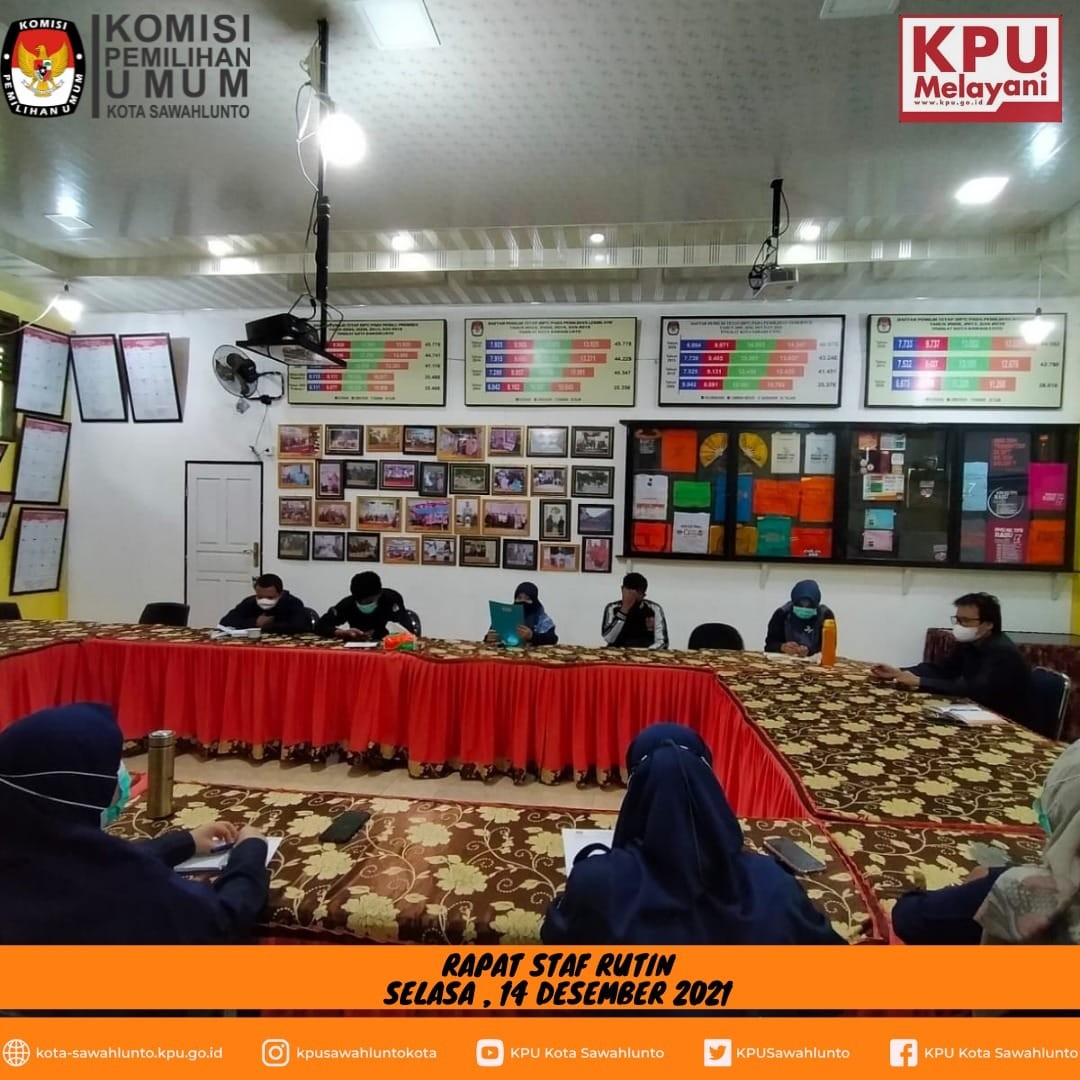 Sawahlunto, kota-sawahlunto.kpu.go.id – KPU Kota Sawahlunto pada hari Selasa (14/12) melaksanakan rapat staf rutin yang diikuti oleh seluruh Sekretariat yang dipimpin oleh Sekretaris KPU Kota Sawahlunto. Kegiatan rapat dimulai Pukul 09.00 WIB dan dihadiri oleh Sekretaris, Kasubbag/Subkoordinator beserta seluruh staf pelaksana.