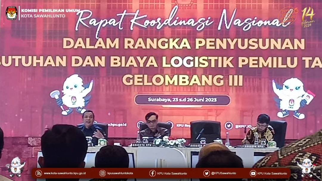 Sawahlunto, kota-sawahlunto.kpu.go.id - KPU Kota Sawahlunto mengikuti kegiatan Rapat Koordinasi Nasional Dalam Rangka Penyusunan Kebutuhan dan Biaya Logistik Pemilu Tahun 2024 Gelombang III di Surabaya, Jawa Timur 23 - 26 Juni 2023.