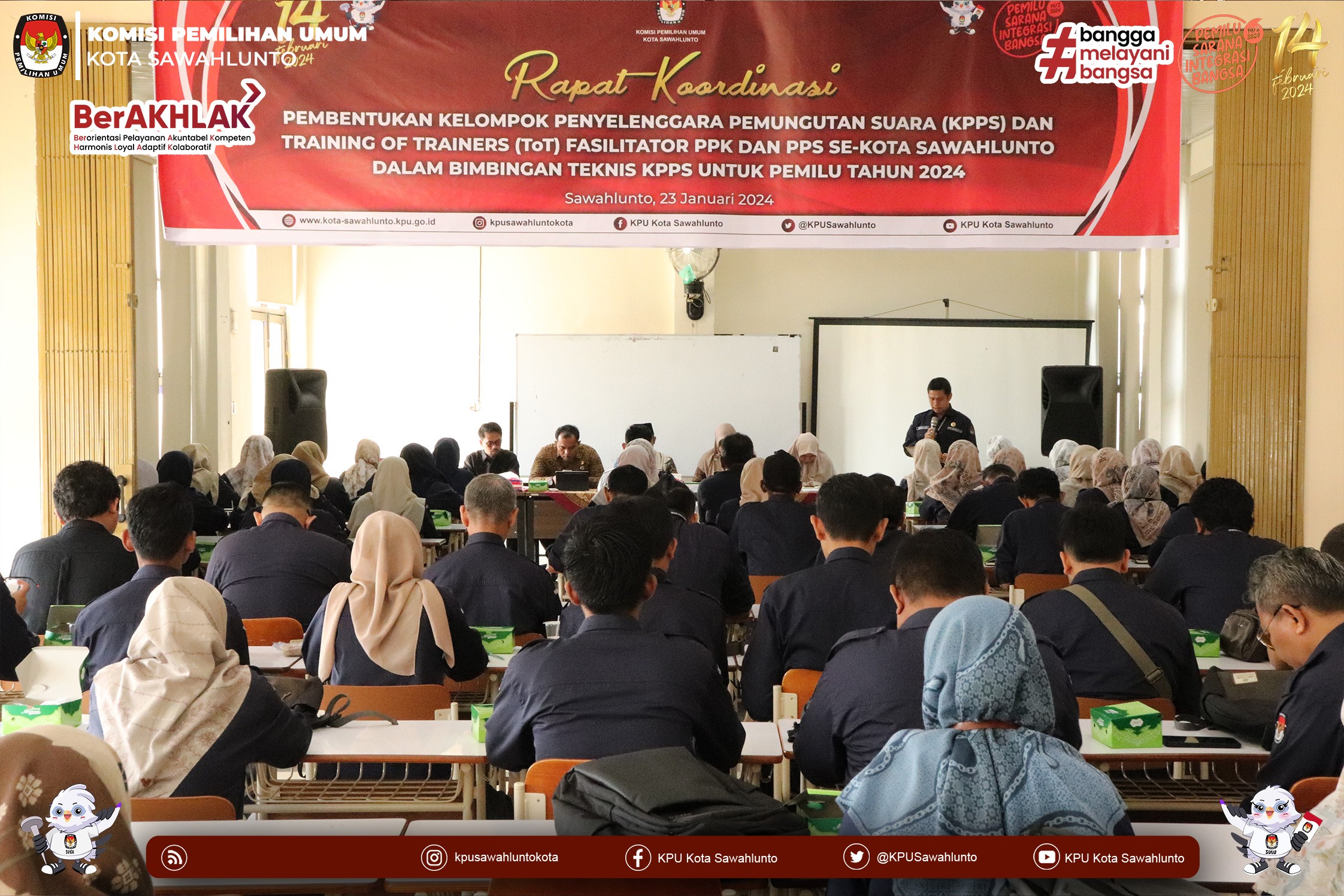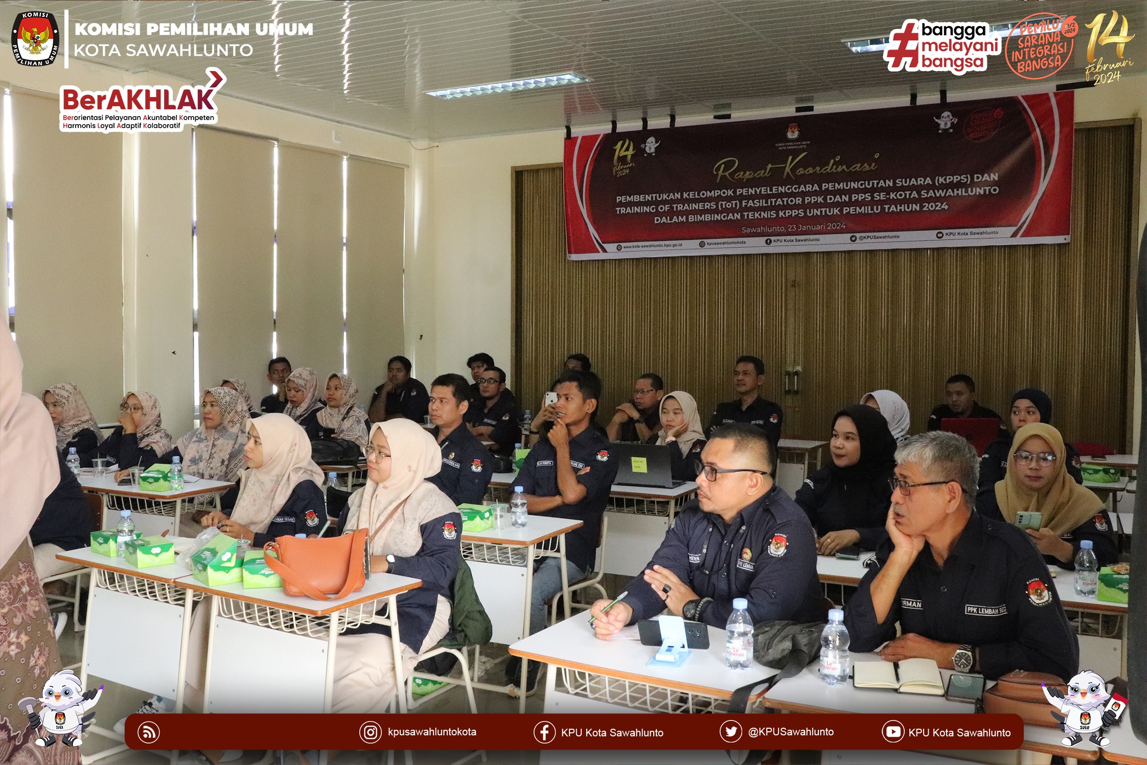 KPU Kota Sawahlunto laksanakan Rapat Koordinasi Pembentukan Kelompok Penyelenggara Pemungutan Suara (KPPS) dan Training of Trainers (ToT) Fasilitator PPK dan PPS dalam rangka Bimbingan Teknis Pembentukan KPPS tahun 2024, Selasa (23/1) di Kampus PSDKU UNP Kota Sawahlunto.