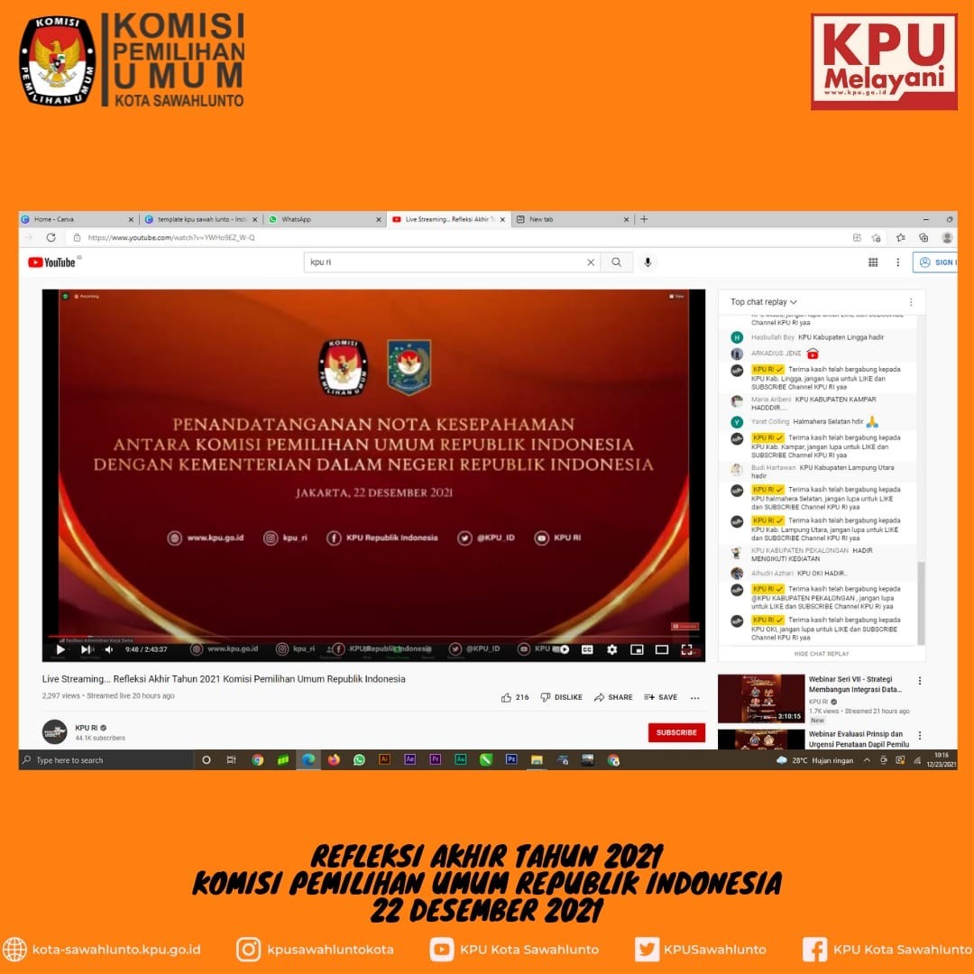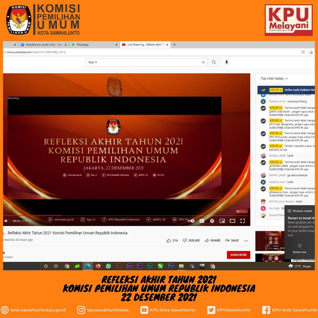 Sawahlunto, kota-sawahlunto.kpu.go.id – Pada hari Rabu (22/12) KPU Kota Sawahlunto mengikuti Webinar Refleksi Akhir Tahun 2021 Komisi Pemilihan Umum Republik Indonesia Tahun 2021. Acara dimulai pukul 13.15 WIB dan diikuti oleh Ketua KPU Kota Sawahlunto beserta Anggota, juga Plt Kasubbag Teknis Penyelengaraan Pemilu, Partisipasi dan Hubungan Masyarakat. Acara ini diikuti oleh KPU Provinsi dan KPU Kabupaten/Kota se Indonesia disaksikan secara live di akun youtube KPU RI.