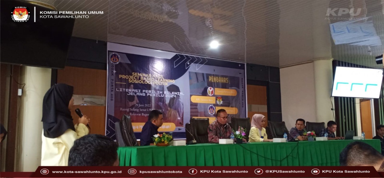 Sawahlunto, kota-sawahlunto.kpu.go.id – Desy Fardila, S.Pd.,M.Pd Divisi Sosialisasi Pendidikan Pemilih Parmas dan SDM (SP3MSDM) KPU Kota Sawahlunto menjadi penanggap pada Seminar Hasil Project Based Learning Sosiologi Politik dengan tema “Literasi Pemilih Generasi Milenial Jelang Pemilu 2024”, Rabu (29/6) Pukul 09.30 WIB yang bertempat di Ruang Sidang Senat UNP Lantai 3 Rektorat Bagonjong.