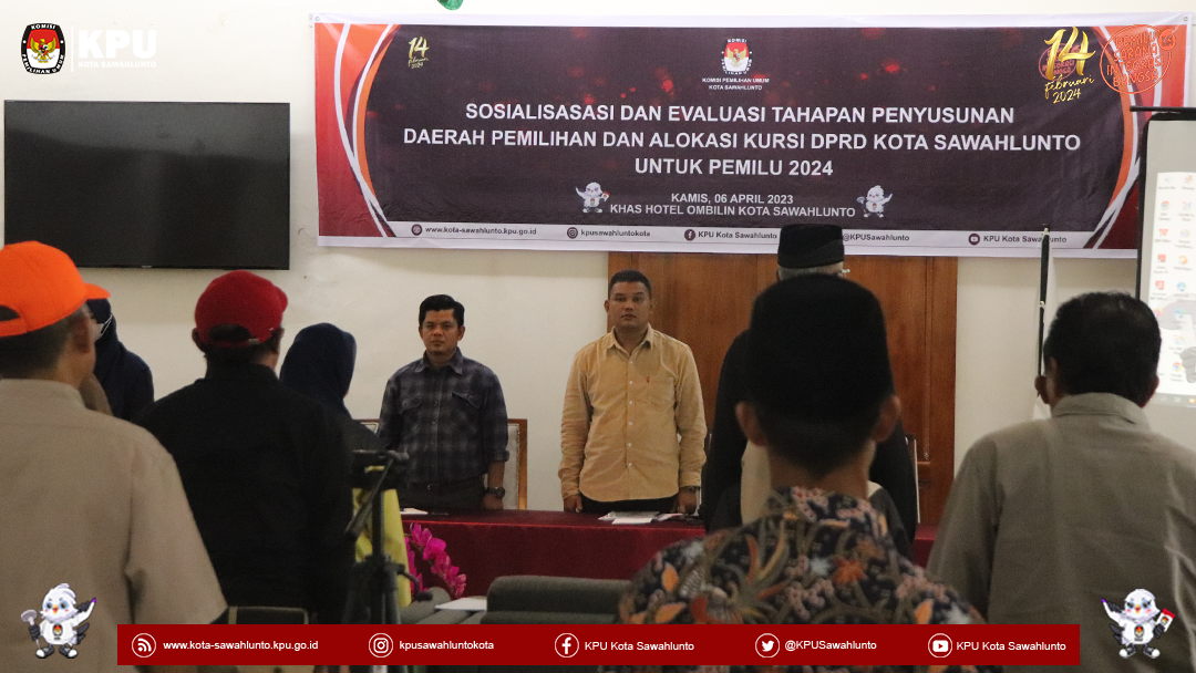 Sawahlunto, kota-sawahlunto.kpu.go.id - KPU Kota Sawahlunto melaksanakan Sosialisasi dan Evaluasi Tahapan Penyusunan Daerah Pemilihan dan Alokasi Kursi di Khas Ombilin Hotel Sawahlunto, Kamis (6/4). Sosialisasi ini berlangsung pada pukul 16.00 WIB yang diikuti oleh Pemerintah Daerah, Tokoh Masyarakat, Akademisi, Partai Politik, dan Internal KPU. Kegiatan ini merupakan tidaklanjut Peraturan KPU nomor 6 Tahun 2022 Pasal 25 bahwa KPU, KPU Provinsi, dan KPU Kabupaten/Kota melakukan Sosialisasi daerah Pemilihan dan Alokasi Kursi setiap daerah Pemilihan Anggota Dewan Perwakilan Rakyat, Anggota Dewan Perwakilan Rakyat Daerah Provinsi, dan/atau Anggota Dewan Perwakilan Rakyat Daerah Kabupaten/Kota.