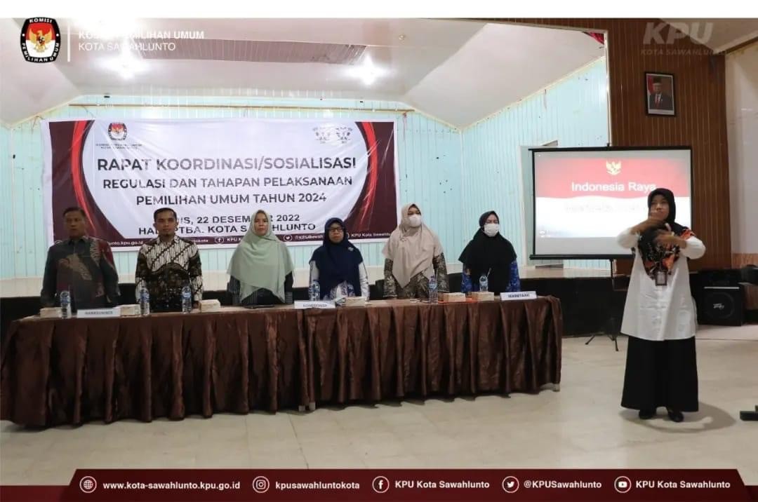 Sawahlunto, kota-sawahlunto.kpu.go.id - KPU Kota Sawahlunto melaksanakan Sosialisasi Tahapan Pemilihan Umum Tahun 2024. Kegiatan ini bertempat di Hall PT BA Kota Sawahlunto, Kamis (22/12). Acara dimulai pada pukul 08.00 WIB ini diikuti oleh Komisioner, Sekretaris dan Staf Sekretariat KPU Kota Sawahlunto. Kegiatan dibuka secara resmi oleh Ketua Divisi Sosialisasi, Pendidikan Pemilih, Parmas dan SDM KPU Kota Sawahlunto Desy Fardila, dalam sambutannya menyampaikan bahwa dengan adanya sosialisasi ini tahapan-tahapan Pemilu tersampaikan kepada masyarakat luas terutama di Kota Sawahlunto.