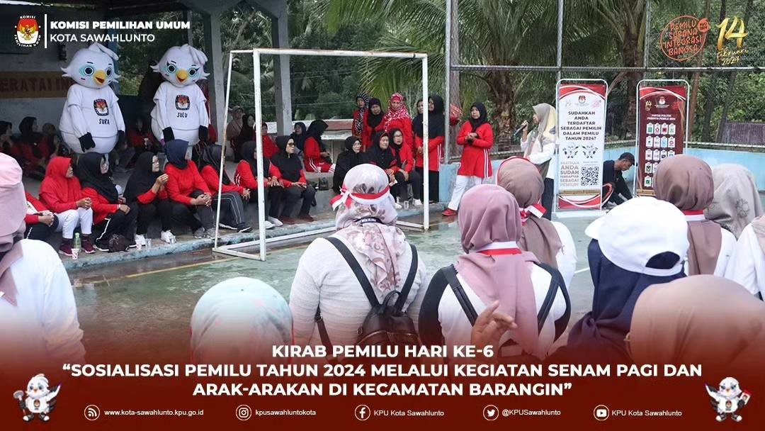 Sawahlunto, kota-sawahlunto.kpu.go.id - Pelaksanaan Kirab Pemilu Tahun 2024 Jalur I (Asal Aceh) di Kota Sawahlunto pada hari keenam, Sabtu (8/7). Kegiatan diawali dengan sosialisasi dalam kegiatan senam pagi yang dimulai pukul 07.30 WIB di Lapangan Rumah Empat Sungai Durian bersama masyarakat Kecamatan Barangin. Sosialisasi Pemilu 2024 yang disampaikan oleh Akhaswita Divisi Hukum dan Pengawasan KPU Kota Sawahlunto dan setelah pelaksanaan senam dilanjutkan dengan mengadakan games Kepemiluan dalam bentuk Games Balon Pemilu, Games Lompatan Pemilih dan Games Coblos Yuk dan pemenang mendapatkan doorprize/merchandice menarik. Kegiatan selanjutnya arak-arakan mobil Bendera Kirab mengelilingi Kecamatan Barangin dengan memperdengarkan jingle Pemilu 2024 dan Sosialisasi dengan pengeras suara untuk datang ke TPS 14 Februari 2024 dan pastikan sudah terdaftar sebagai pemili.Dan pada kesempatan ini juga dilakukan foto bersama dengan Badan Ad Hoc Wilayah Kecamatan Barangin di Puncak Cemara dengan membawa 18 Bendera Partai Politik. Setelah itu arak-arakan dilakukan kegiatan sosialisasi menyusuri Wilayah Desa dan Kelurahan di Kecamatan Barangin yang berakhir di Kantor KPU Kota Sawahlunto. Rombongan Tim kirab hari keenam di ikuti oleh Anggota KPU Kota Sawahlunto, Sekretariat KPU Kota Sawahlunto, Perwakilan dari Polres Sawahlunto, PPK dan Anggota beserta Sekretariat Kecamatan Barangin, PPS dan Anggota beserta Sekretariat se Kecamatan Barangin dan juga diramaikan oleh Mahasiswa KKn dari Universitas UNP.