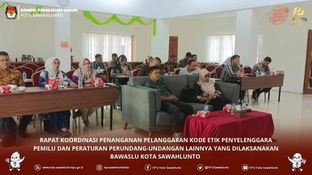 Sawahlunto, kota-sawahlunto.kpu.go.id - Rabu (31/5) KPU Kota Sawahlunto menghadiri Rapat Koordinasi Penanganan Pelanggaran Kode Etik Penyelenggara Pemilu dan Peraturan Perundangan-Undangan Lainnya yang dilaksanakan Bawaslu Kota Sawahlunto. Rakor ini dihadiri oleh Ketua, Divisi Hukum dan Pengawasan KPU Kota Sawahlunto serta masing-masing 1 (satu) orang Panitia Pemilihan Kecamatan (PPK). Kegiatan dimulai pada pukul 09.00 Wib yang dilaksanakan di Hotel Khas Ombilin Kota Sawahlunto. Arlin Junaidi selaku Divisi Penanganan Pelanggaran dan Penyelesaian Sengketa memaparkan materi terkait Asas Penyelenggaraan Pemilu. Dalam menyelenggarakan Pemilu, Penyelenggara harus melaksanakan Pemilu berdasarkan pada asas Mandiri, Jujur, Adil, Berkepastian Hukum, Tertib, Terbuka, Proposional, Profesional, Akuntabel, Efektif, dan Efesien. Hadir narasumber kedua yaitu Khairul Anwar dari Universitas Muhammadiyah Bukittinggi yang membahas tentang Penanganan Pelanggaran Kode Etik Penyelenggara Pemilu. Kode Etik adalah satu kesatuan landasan norma moral, etis, dan filosofis yang menjadi pedoman bagi perilaku penyelenggara Pemilu yang diwajibkan, dilarang, patut atau tidak patut dilakukan dalam semua tindakan dan ucapan. Kode Etik Penyelenggara Pemilu bertujuan untuk menjaga kemandirian, integritas dan kredibilitas bagi KPU dan Bawaslu.