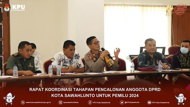 Sawahlunto, kota-sawahlunto.kpu.go.id - KPU Kota Sawahlunto (27/4) melaksanakan Rapat Koordinasi Tahapan Pencalonan Anggota DPRD Kota Sawahlunto untuk Pemilu Tahun 2024 dengan Stakeholder terkait. Rakor dilaksanakan di Khas Ombilin Hotel Kota Sawahlunto pada pukul 13.00 Wib. Acara ini dihadiri oleh Kejaksaan Negeri, Polres, Dandim 0310/SSD, Sekretaris DPRD, Bawaslu, BNN, BKPSDM, Lapas Narkotika, Rutan Kelas II B, Disdukcapil, Dinas Sosial PMD PPPA, RSUD, Tata Pemerintahan, Kepala Cabang Dinas Pendidikan Provinsi Sumatera Barat dan Internal KPU Kota Sawahlunto.