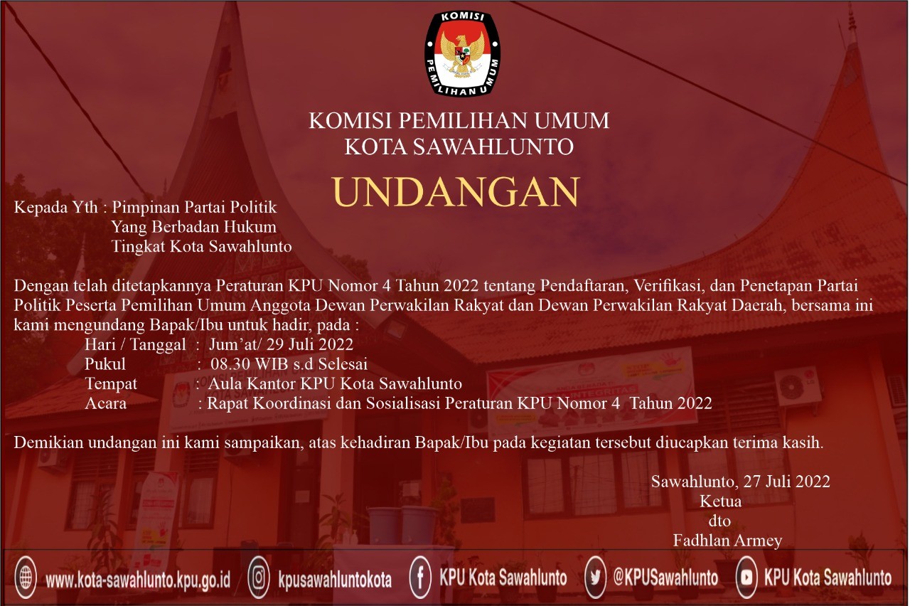 Sawahlunto, kota-sawahlunto.kpu.go.id – KPU Kota Sawahlunto menggelar Rapat Koordinasi dan Sosialisasi Peraturan KPU (PKPU) Nomor 4 Tahun 2022 tentang Pendaftaran, Verifikasi, dan Penetapan Partai Politik Peserta Pemilihan Umum Anggota Dewan Perwakilan Rakyat dan Dewan Perwakilan Rakyat Daerah. Dalam kegiatan ini mengundang Stakeholder terkait dan Partai Politik Yang Berbadan Hukum Tingkat Kota Sawahlunto, Jum'at (29/7) bertempat di Aula Kantor KPU Kota Sawahlunto yang dimulai pada Pukul 08.30 WIB. Ketua KPU Kota Sawahlunto Fadhlan Armey dalam sambutannya menyampaikan KPU RI pada tanggal 14 Juni kemaren telah melakukan peluncuran tahapan Pemilihan Umum 2024 yang menandakan dimulainya tahapan Pemilu untuk memilih Presiden dan Wakil Presiden, DPD, DPR, DPRD Provinsi dan DPRD Kabupaten/Kota yang akan kita laksanakan pada tanggal 14 Februari 2024. Peraturan KPU Nomor 4 Tahun 2022 ini mengatur tentang Pelaksanaan Penerimaan Pendaftaran Partai Politik, Pelaksanaan Verifikasi dan Penetapan Partai Politik. Sebagai informasi bahwa tahapan Pemilu saat ini sudah sampai pada tahap pengumuman pendaftaran partai politik, yakni mulai tanggal 29-31 Juli 2022. “Semoga dengan Sosialisasi Peraturan KPU Nomor 4 Tahun 2022 ini dapat menambah informasi tentang tata cara pendaftaran dan verifikasi Partai Politik calon peserta Pemilu 2024", ujar Fadhlan di akhir sambutannya. Selanjutnya Jasmadi Divisi Teknis Penyelenggaraan KPU Kota Sawahlunto menyampaikan bahwa dengan merujuk pada UU Nomor 7 Tahun 2017 Tentang Pemilu, tahapan Pendaftaran Partai Politik dimulai 18 bulan sebelum hari pemungutan suara pada 14 Februari 2024 dan tahapan Penetapan Partai Politik Peserta Pemilu 2024 dilakukan 14 bulan sebelum hari pemungutan suara. Pendaftaran dan penyampaian dokumen persyaratan pendaftaran oleh Partai Politik akan dimulai pada tanggal 1-14 Agustus 2022 yang akan terpusat di KPU RI. Artinya, yang melakukan pendaftaran Partai Politik adalah pimpinan partai politik tingkat pusat. Selanjutnya, KPU kabupaten/kota hanya melakukan verifikasi administrasi dan verifikasi faktual. Pendaftaran dilakukan melalui Sistem Informasi Partai Politik (SIPOL) yang mana aksesnya sudah dibuka mulai tanggal 24 Juni sampai masa pendaftaran berakhir. Sipol merupakan sistem teknologi informasi yang disediakan KPU untuk membantu parpol dan penyelenggara pemilu dalam tahap pendaftaran pemilu, penelitian administrasi, dan verifikasi faktual. Jasmadi juga menyampaikan Pemenuhan Persyaratan Kepengurusan dan Keanggotaan Partai Politik tingkat Kota Sawahlunto untuk Pemilu 2024 berdasarkan Keputusan KPU Nomor 194 Tahun 2022, memiliki kepengurusan 50 % jumlah Kecamatan yaitu 2 Kecamatan. Sedangkan keanggotaan sekurang-kurangnya 1.000 (seribu) orang atau 1/1.000 (satu per seribu) orang dari jumlah penduduk kota Sawahlunto, yaitu Penduduk : 66,962 : 1/1000 (satu perseribu) dari Jumlah Penduduk sebanyak 66 jiwa. Nantinya, KPU Kota sawahlunto juga membentuk helpdesk fasilitasi dan konsultasi bagi calon peserta pemilu tingkat Kota Sawahlunto.