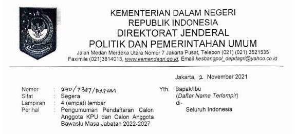 Sebagai informasi, hari ini (05/11) pada akun Youtube DITJEN POLITIK DAN PEMERINTAHAN UMUM KEMENDAGRI juga melakukan SOSIALISASI SELEKSI CALON ANGGOTA KPU RI DAN BAWASLU RI MASA JABATAN TAHUN 2022 – 2027. Untuk mengetahui informasi yang ada dalam sosialisasi tersebut silahkan kunjungi https://www.youtube.com/watch?v=3KkDOz7YGx4