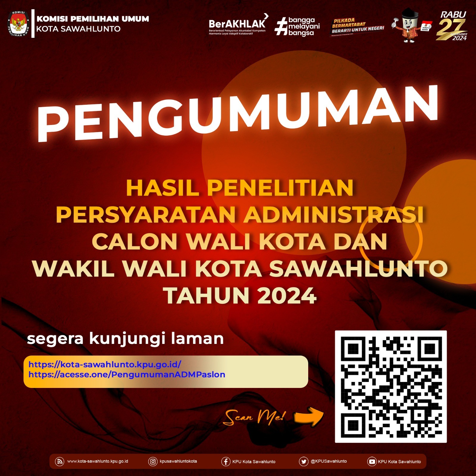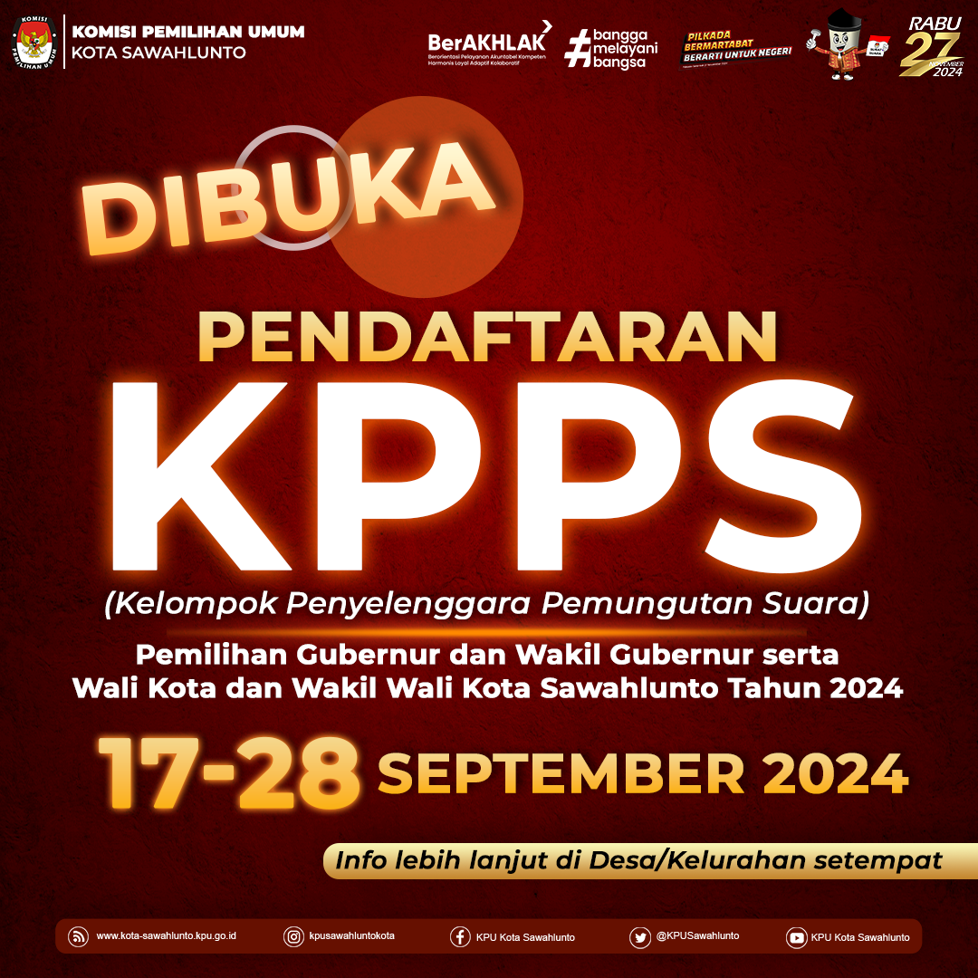 Berikut kami umumkan, Pengumuman tentang Pendaftaran Calon Anggota Kelompok Penyelenggara Pemungutan Suara (KPPS) Pemilihan Serentak Nasional Tahun 2024 Kota Sawahlunto.