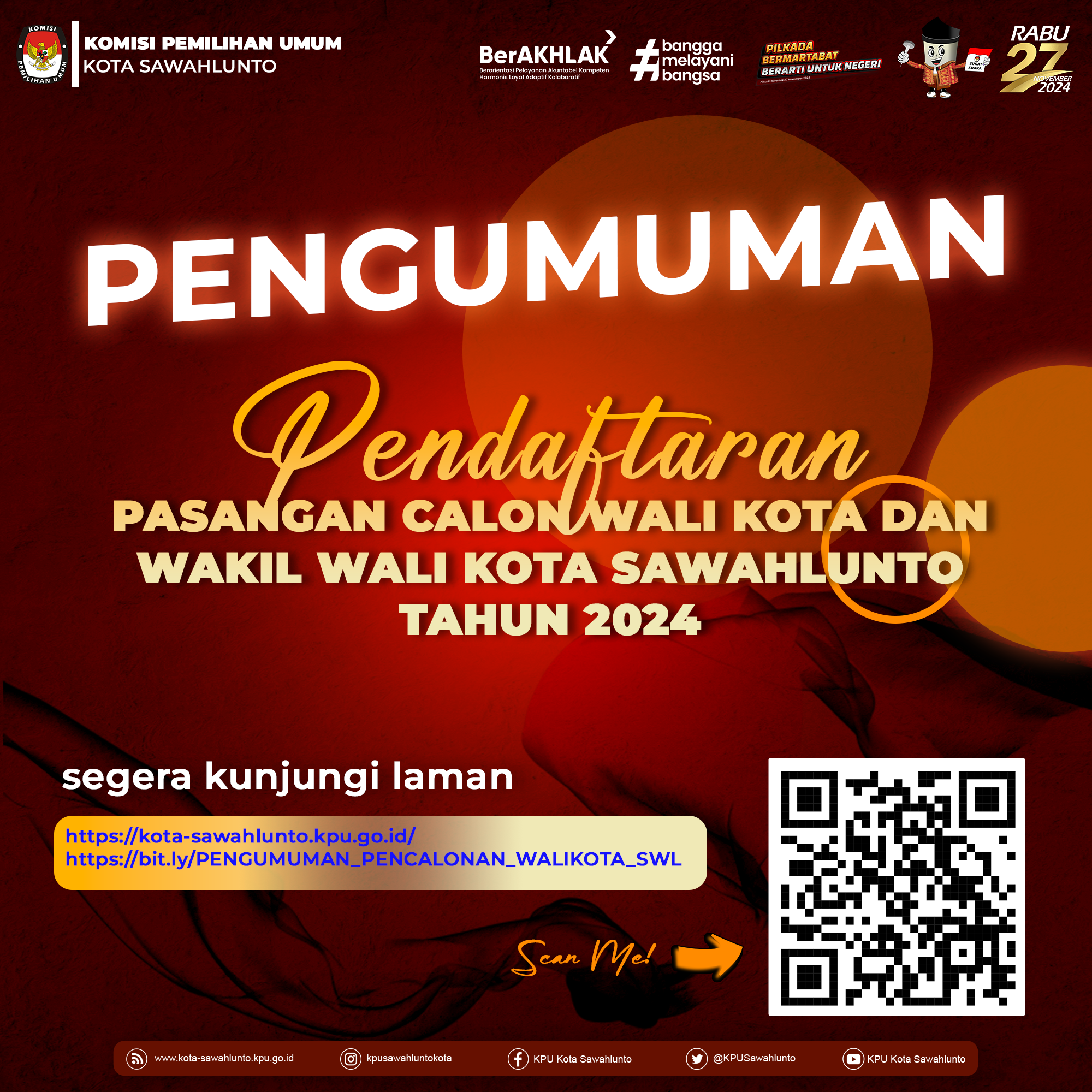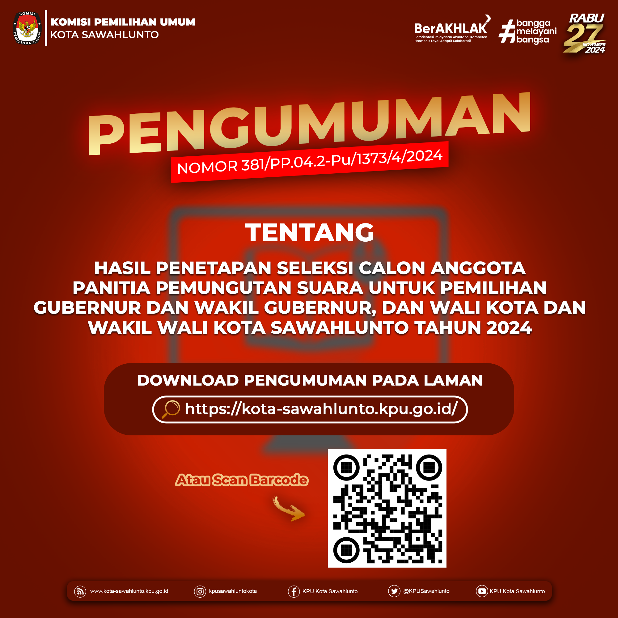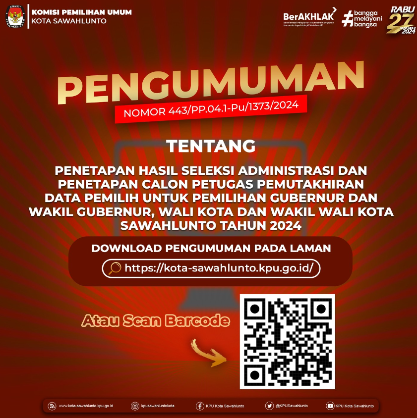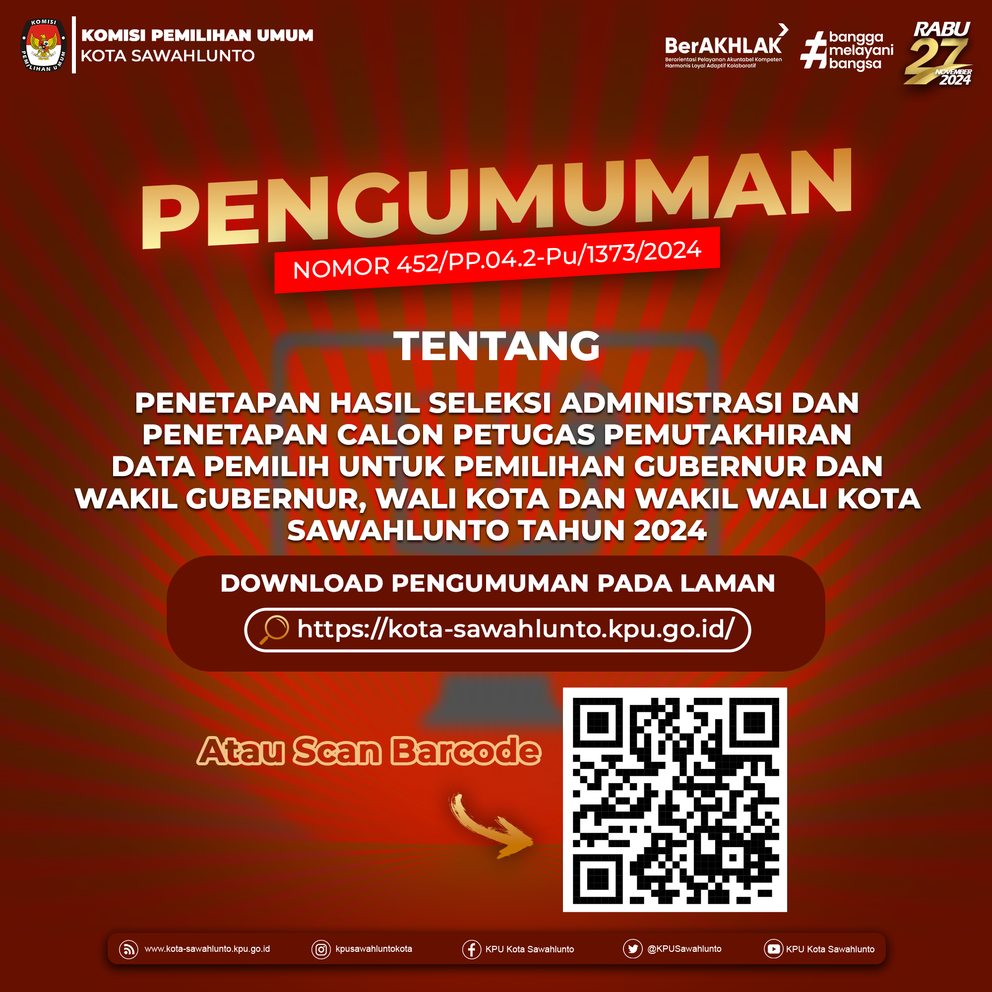 Hallo Teman Pemilih Kota Sawahlunto, berikut kami sampaikan Pengumuman Tentang Penetapan Hasil Administrasi dan Penetapan Calon Petugas Pemutakhiran Data Pemilih Kelurahan Lubang Panjang Untuk Pemilihan Gubernur dan Wakil Gubernur, Wali Kota dan Wakil Wali Kota Sawahlunto Untuk Pemilihan Serentak Nasional Tahun 2024 Kota Sawahlunto