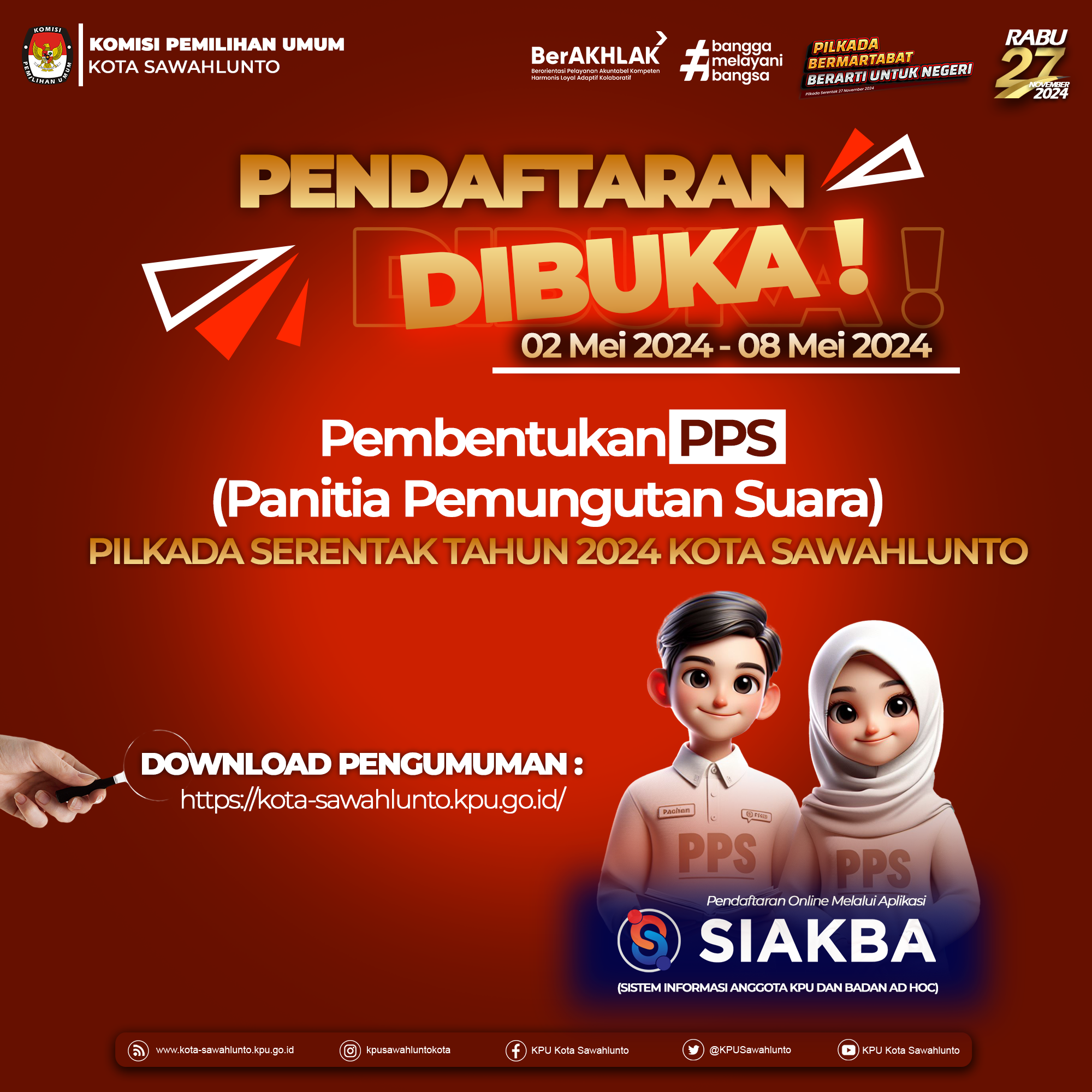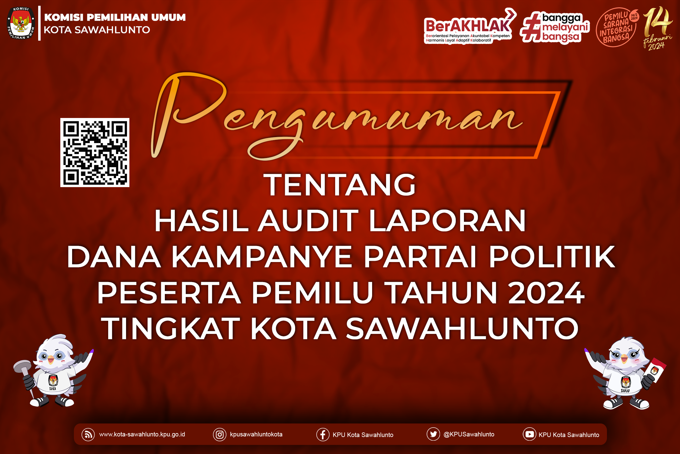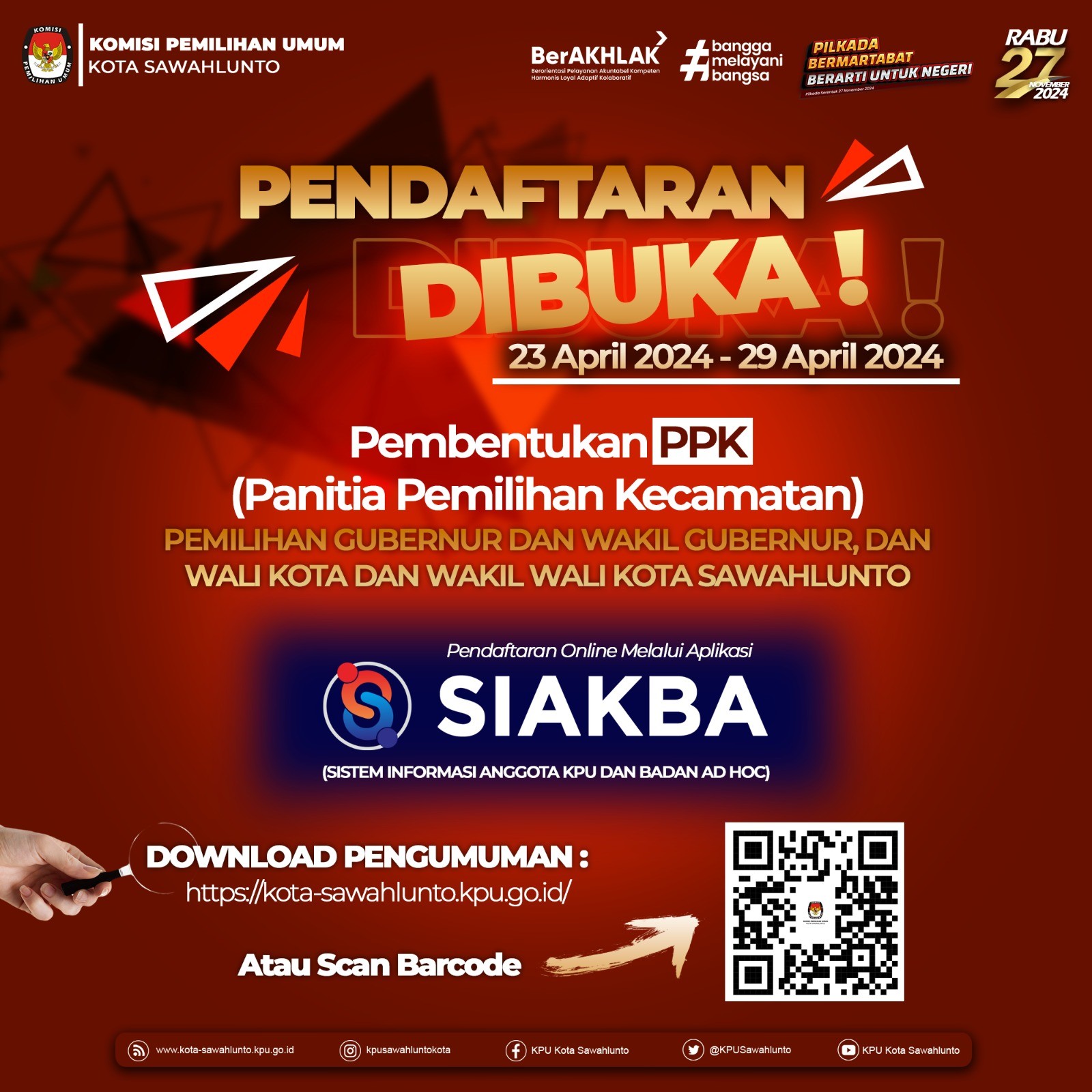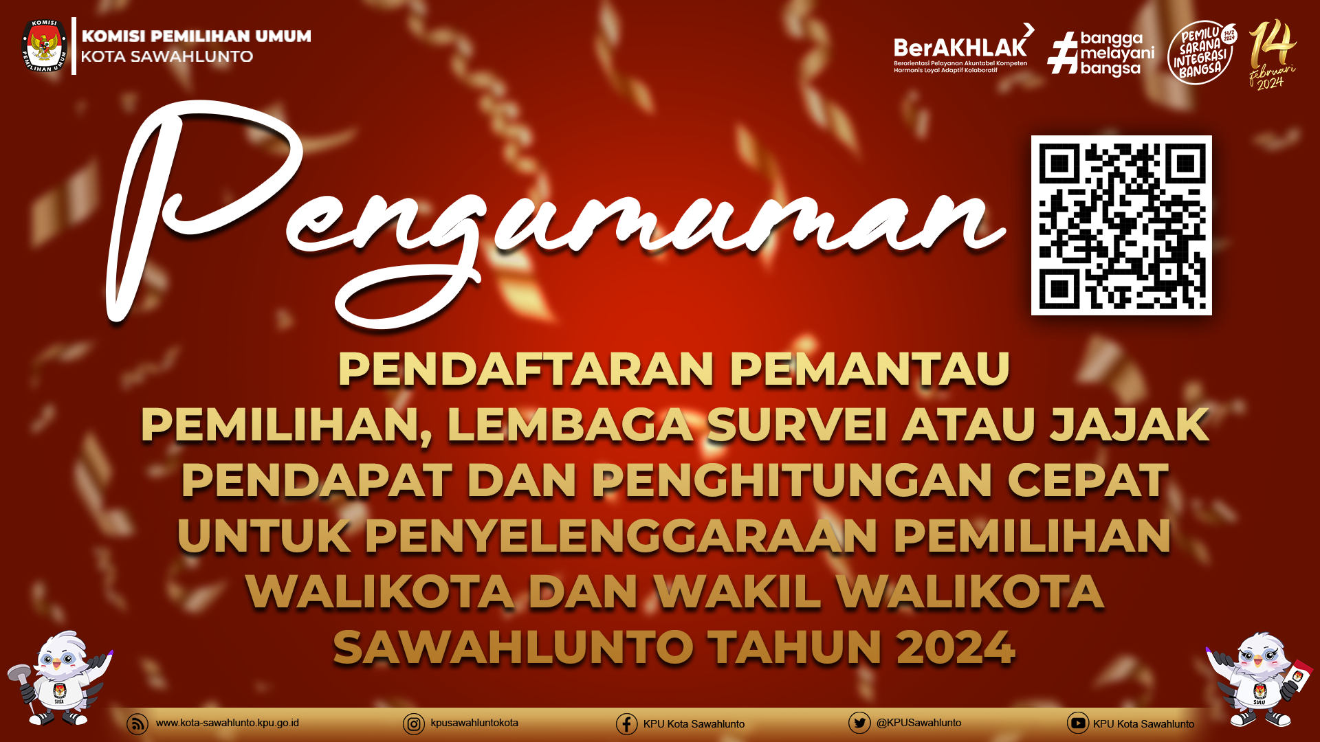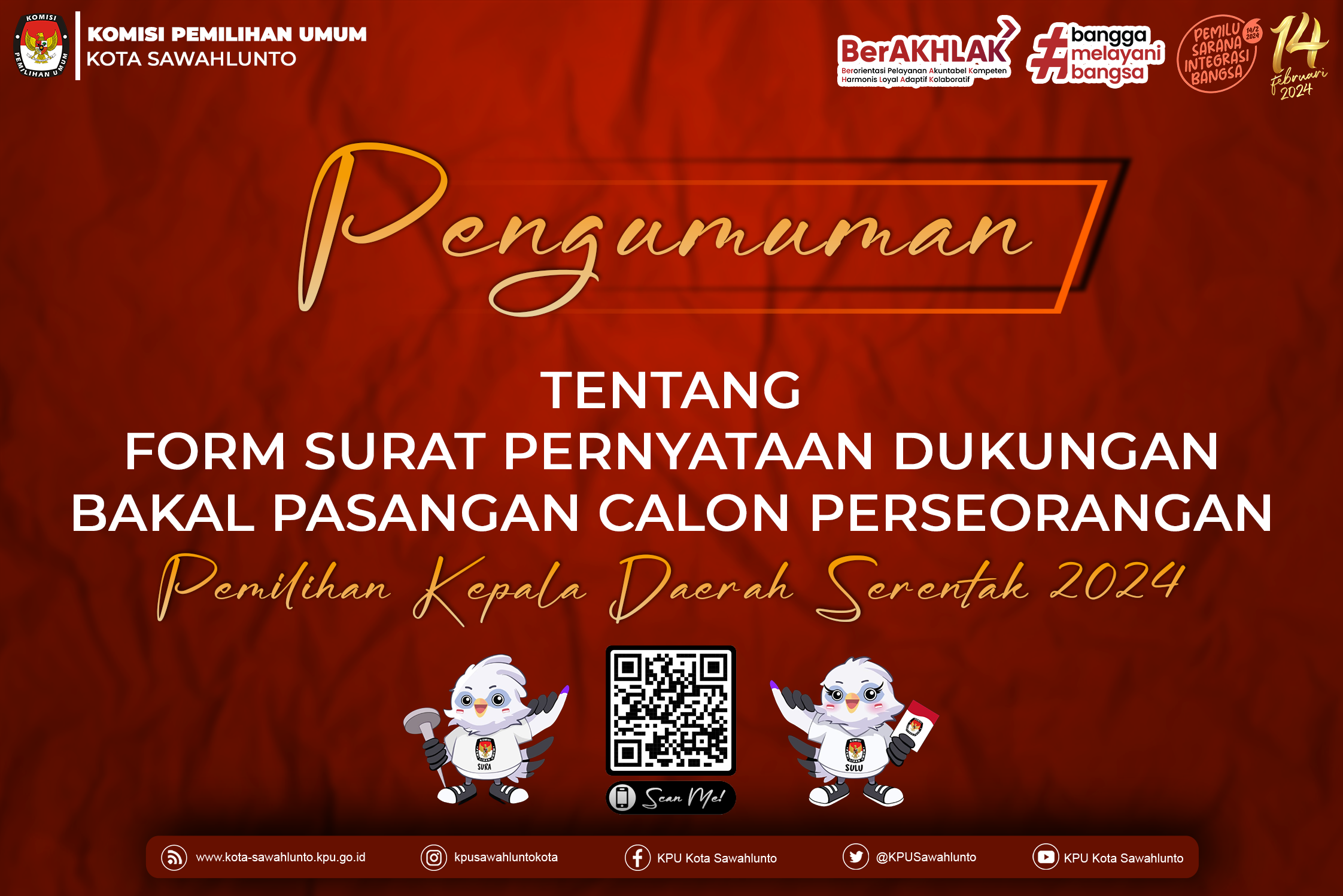 Oh ya, form pengumuman beserta lampiran bisa diunduh melalui QR Code pada poster ini ya. Informasi lebih lanjut bisa menghubungi narahubung yang tertera pada pengumuman dan pantengin terus media sosial KPU Kota Sawahlunto ya?✨