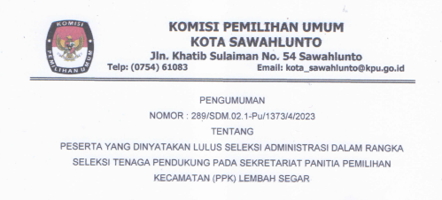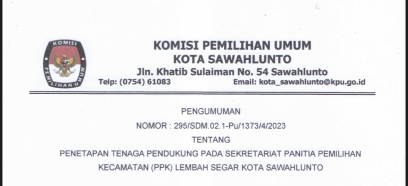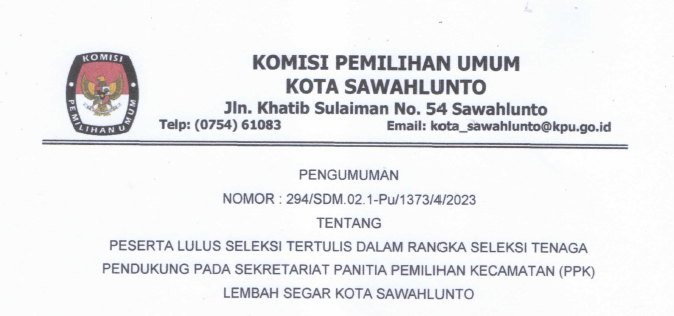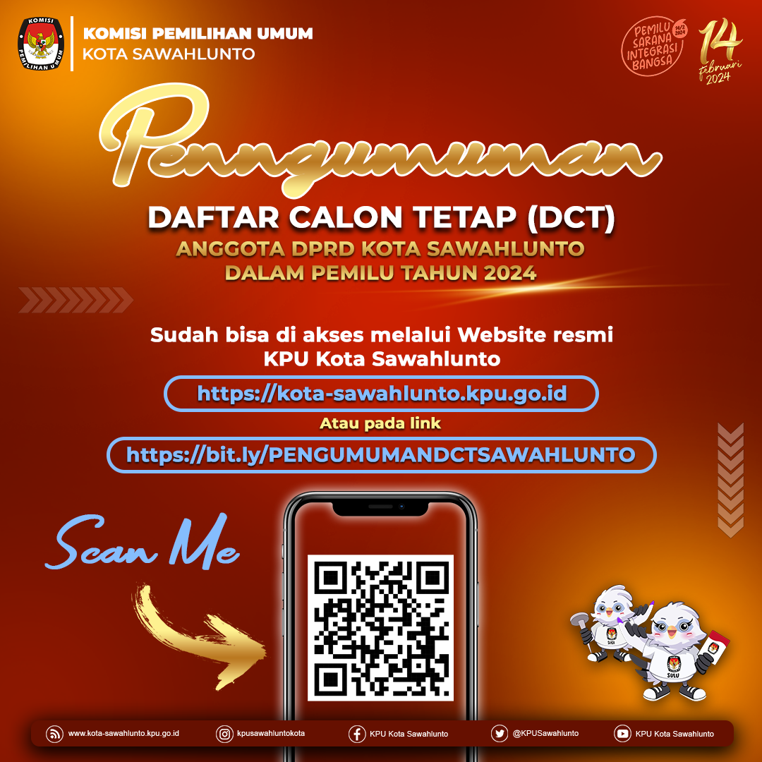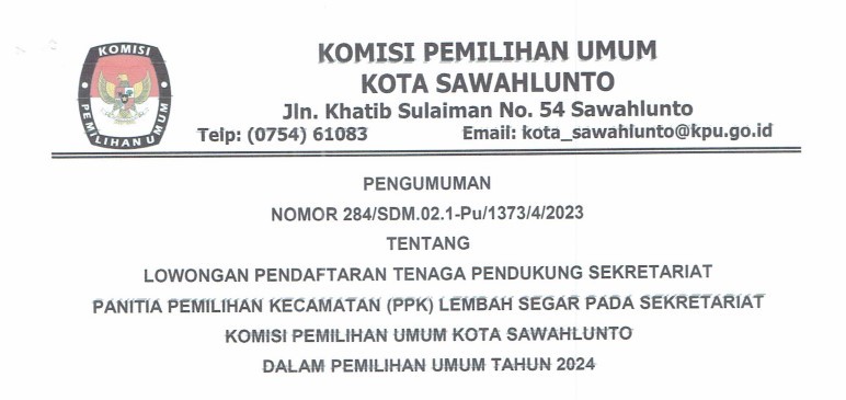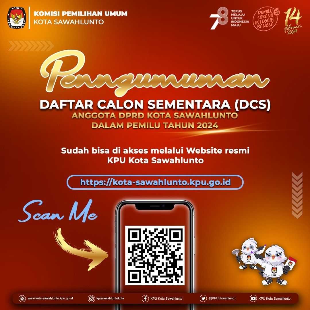 Sawahlunto, kota-sawahlunto.kpu.go.id - sesuai dengan ketentuan Pasal 70 PKPU Nomor 10 Tahun 2023 tentang Pencalonan Anggota DPR, DPRD Provinsi dan DPRD Kab/Kota, maka KPU Kota Sawahlunto mengumumkan Daftar Calon Sementara (DCS) Anggota DPRD Kota Sawahlunto dan Persentase Keterwakilan Perempuan dalam DCS. Pengumuman klik .......(Di Sini) SK DCS klik ...... (Di Sini) Masyarakat dapat menyampaikan masukan dan tanggapan terhadap calon sementara anggota DPRD Kota Sawahlunto dari tanggal 19-28 Agustus 2023, dengan memperhatikan hal-hal berikut : 1. Masukan dan tanggapan masyarakat disampaikan secara tertulis terkait pemenuhan persyaratan administrasi bakal calon anggota DPRD Kota Sawahlunto; 2.Masukan dan tanggapan masyarakat disertai dengan bukti identitas diri dan bukti yang relevan kepada KPU Kota Sawahlunto melalui; A. Website info pemilu KPU : https://infopemilu.kpu.go.id B. Kantor KPU Kota Sawahlunto beralamat di Jalan Khatib Sulaiman No. 54 Desa Santur Kecamatan Barangin Kota Sawahlunto C. Email : kpusawahlunto@gmail.com 3. Informasi lebih lanjut dapat menghubungi helpdesk pencalonan KPU Kota Sawahlunto.