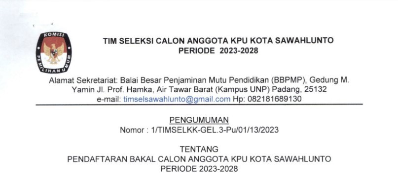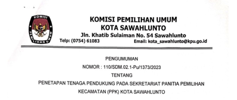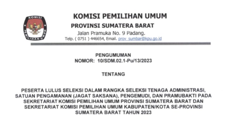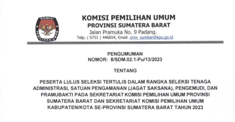 Sawahlunto, kota-sawahlunto.kpu.go.id - PENGUMUMAN NOMOR: 8/SDM.02.1-Pu/13/2023 TENTANG PESERTA LULUS SELEKSI TERTULIS DALAM RANGKA SELEKSI TENAGA ADMINISTRASI, SATUAN PENGAMANAN (JAGAT SAKSANA), PENGEMUDI, DAN PRAMUBAKTI PADA SEKRETARIAT KOMISI PEMILIHAN UMUM PROVINSI SUMATERA BARAT DAN SEKRETARIAT KOMISI PEMILIHAN UMUM KABUPATEN/KOTA SE-PROVINSI SUMATERA BARAT TAHUN 2023